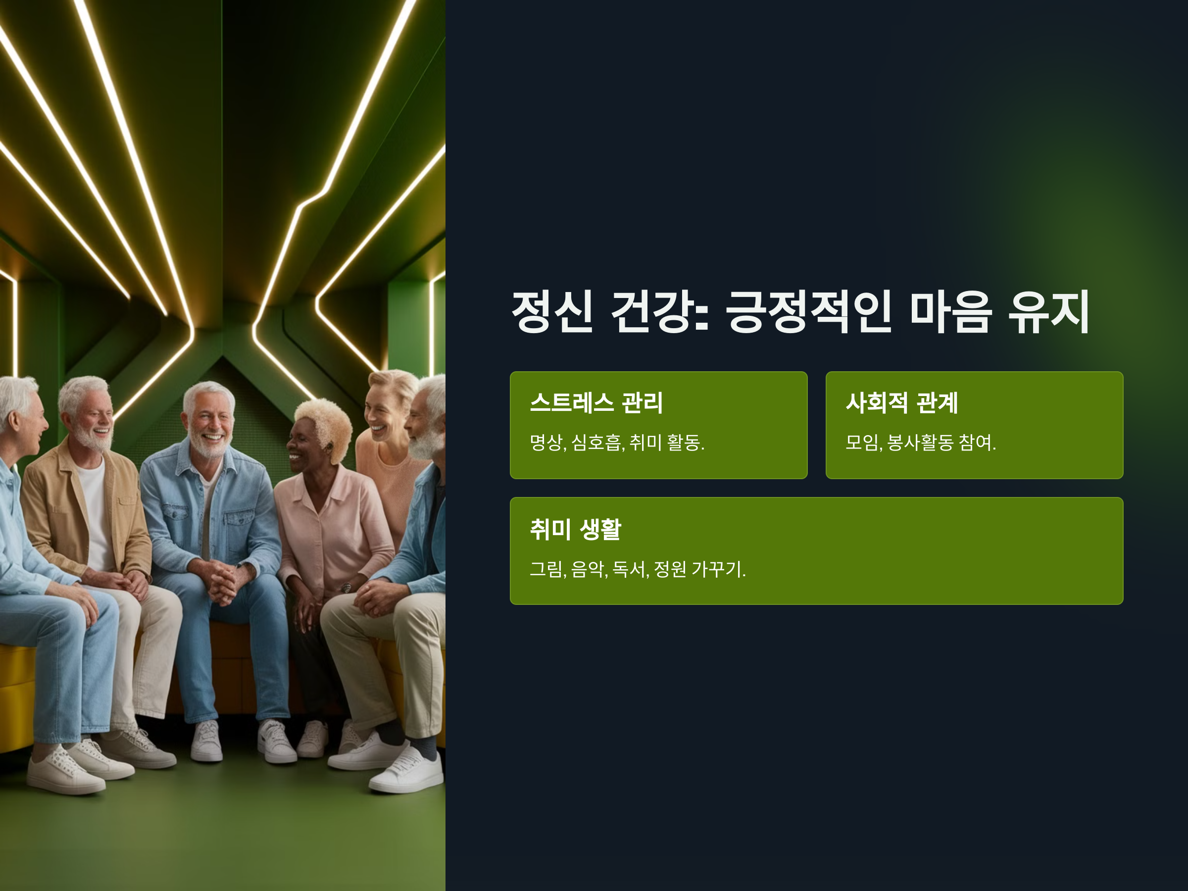 정신 건강을 위해 취미 활동을 즐기고, 규칙적인 사회 활동을 유지하는 것이 좋습니다. 또한, 스트레스 관리를 위해 명상이나 심호흡을 실천하며, 충분한 휴식을 취하는 것도 중요합니다.