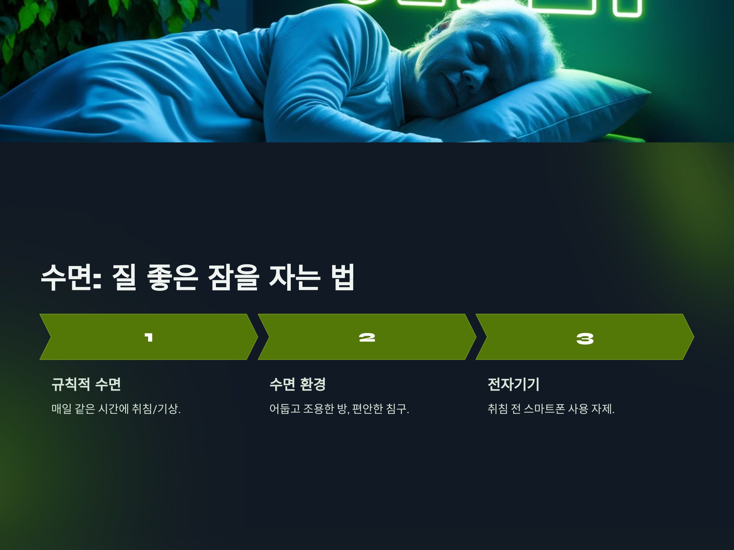 어두운 방에서 편안한 침대와 적당한 온도로 수면 환경을 조성하세요. 스마트폰이나 컴퓨터 화면을 잠자기 전 1시간 이상 멀리 두는 것이 도움이 됩니다.