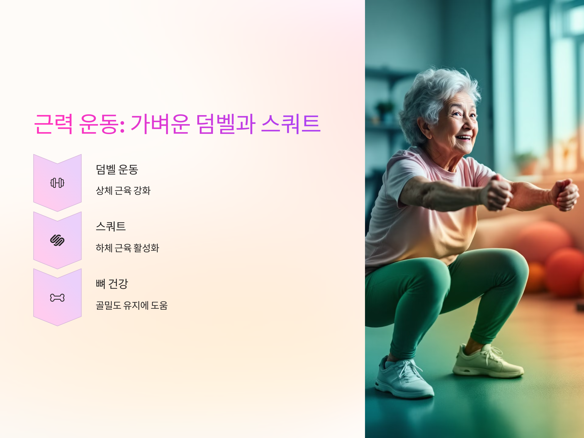 60대 이후에는 근력 운동도 중요합니다. 근육량이 감소하기 시작하면서, 일상적인 활동에 어려움을 겪을 수 있기 때문입니다. 가벼운 덤벨을 이용한 운동은 근력을 키우고 뼈 건강을 유지하는 데 매우 효과적입니다. 덤벨을 이용한 상체 운동은 팔과 어깨 근육을 강화하며, 하체 운동은 다리와 엉덩이 근육을 활성화합니다.