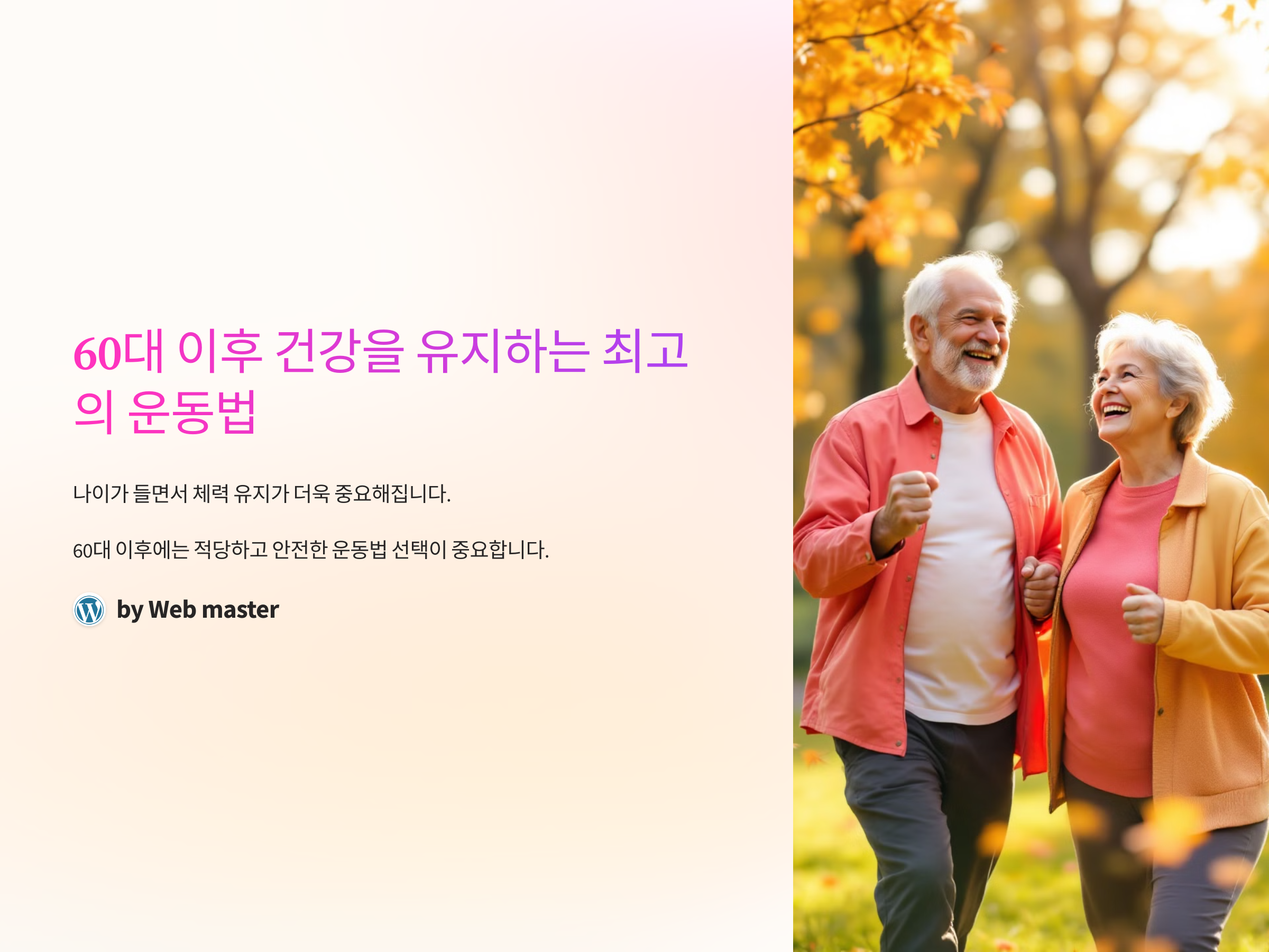 60대 이후에는 운동이 신체 건강을 유지하는 데 중요한 역할을 합니다. 유산소 운동, 근력 운동, 유연성 운동을 적절히 조화롭게 실천하면 건강한 노후를 보낼 수 있습니다. 중요한 것은 지속적으로 운동을 하고, 과도하지 않게 자신의 체력에 맞는 강도로 운동을 조절하는 것입니다. 운동을 통해 체력과 건강을 유지하고, 더 활기찬 삶을 즐기시기 바랍니다.