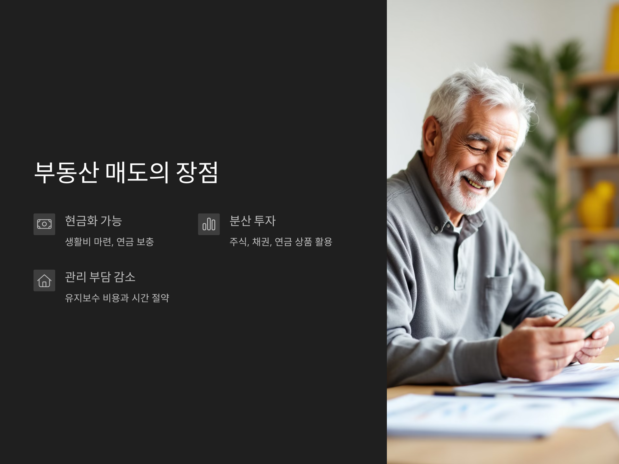 부동산 매도는 60대 이후 현금화가 가능하다는 점에서 매우 큰 장점이 있습니다. 매도 후 그 자금을 통해 필요한 생활비를 마련하거나, 은퇴 후 부족한 연금을 보충하는 데 사용할 수 있습니다. 특히 부동산 시장이 상승세일 경우, 매도를 통해 상당한 이익을 실현할 수 있습니다. 또한, 부동산 관리에 따른 번거로움이나 세금 부담을 줄일 수 있어 더 편안한 생활을 할 수 있는 환경이 됩니다.
