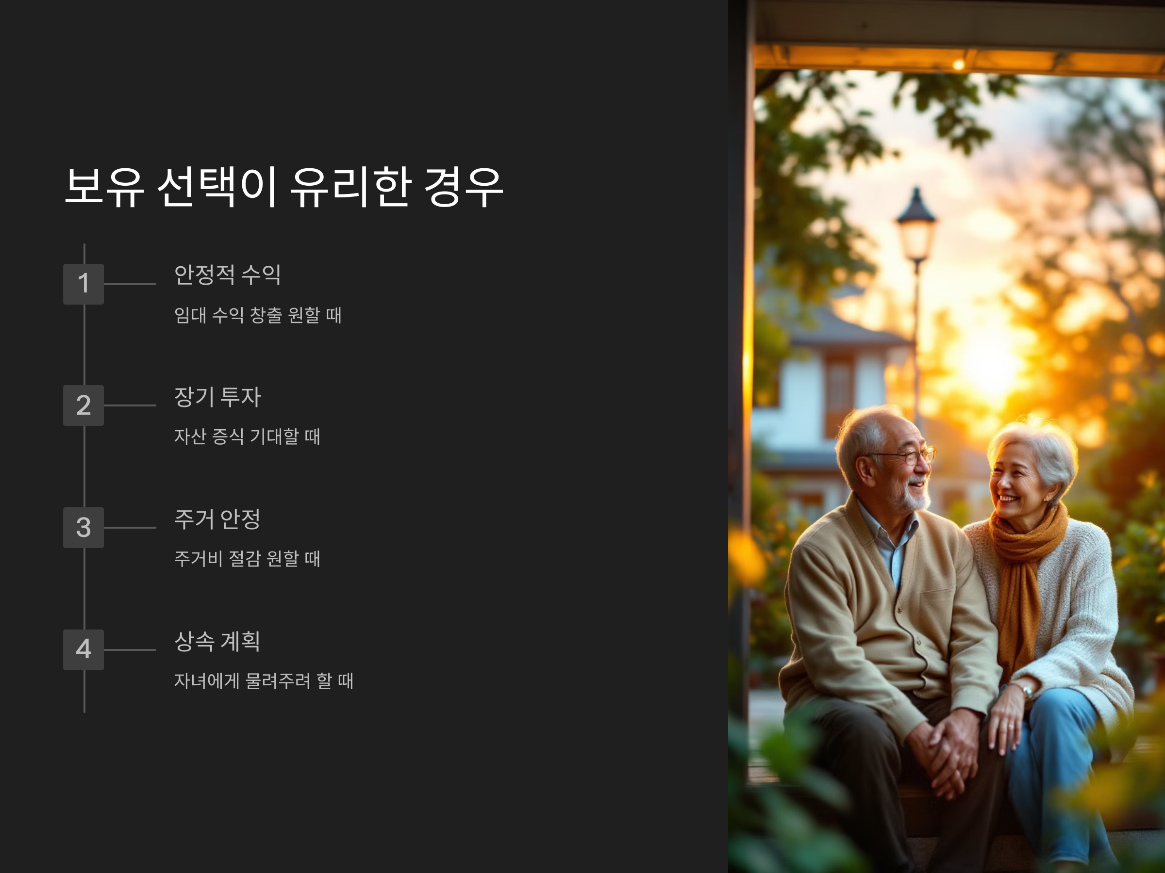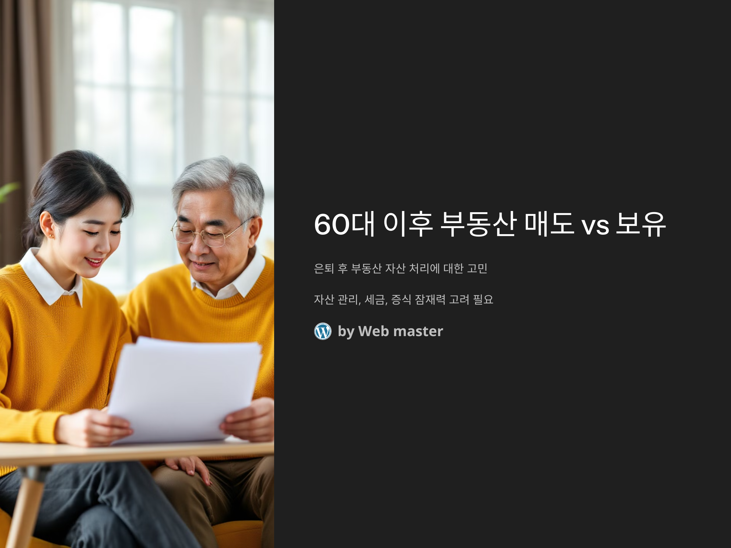 결론적으로, 60대 이후의 부동산 매도와 보유 선택은 각자의 재정적 상황과 목표에 따라 달라질 수 있습니다. 만약 매월 안정적인 수익을 원하고, 자산을 장기적으로 증식시키고 싶다면 부동산 보유가 유리할 수 있습니다. 하지만 매도 후 현금을 확보하고 싶은 경우나, 부동산 관리에 부담을 느낀다면 매도가 더 나은 선택이 될 수 있습니다.