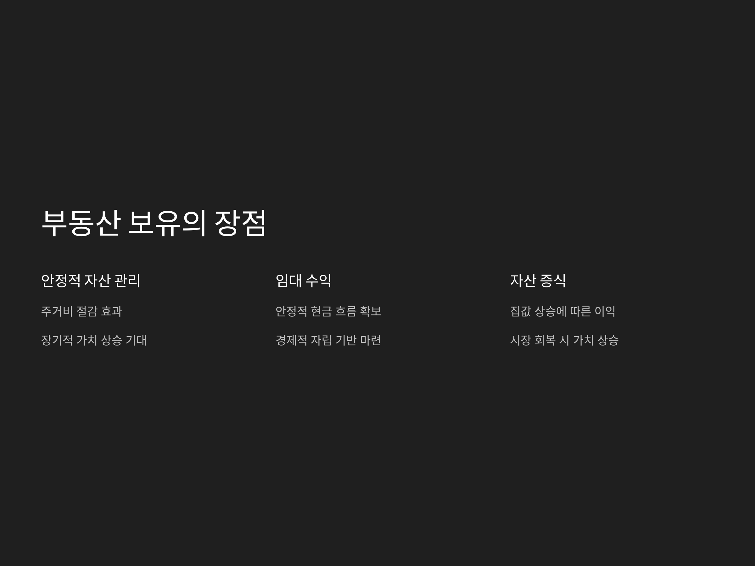 보유의 또 다른 장점은 부동산이 자산으로서 중요한 가치를 지닌다는 것입니다. 집값 상승에 따른 자산 증식은 시간이 지나면서 상당한 이익을 가져다줄 수 있습니다. 부동산 시장이 회복될 경우, 보유한 자산의 가치는 더욱 상승할 가능성이 있습니다.