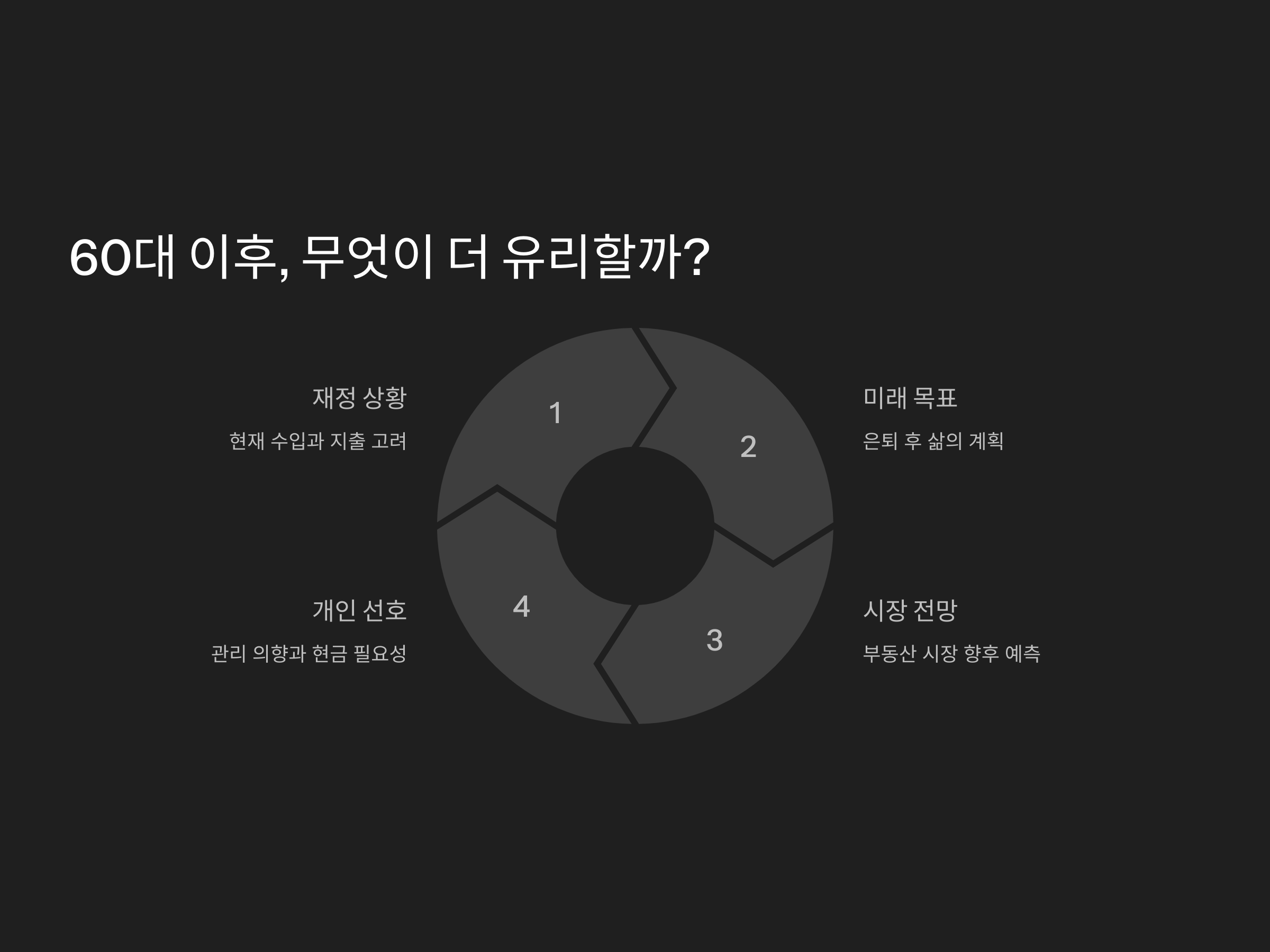 60대 이후에는 은퇴 후의 안정성을 우선시하는 경향이 강해지기 때문에, 현금을 확보하거나 수익을 안정적으로 창출하는 방향으로 선택을 하는 것이 중요합니다. 또한, 부동산 시장의 향후 전망과 본인의 재정 상태를 잘 고려하여, 신중하게 결정을 내려야 합니다.