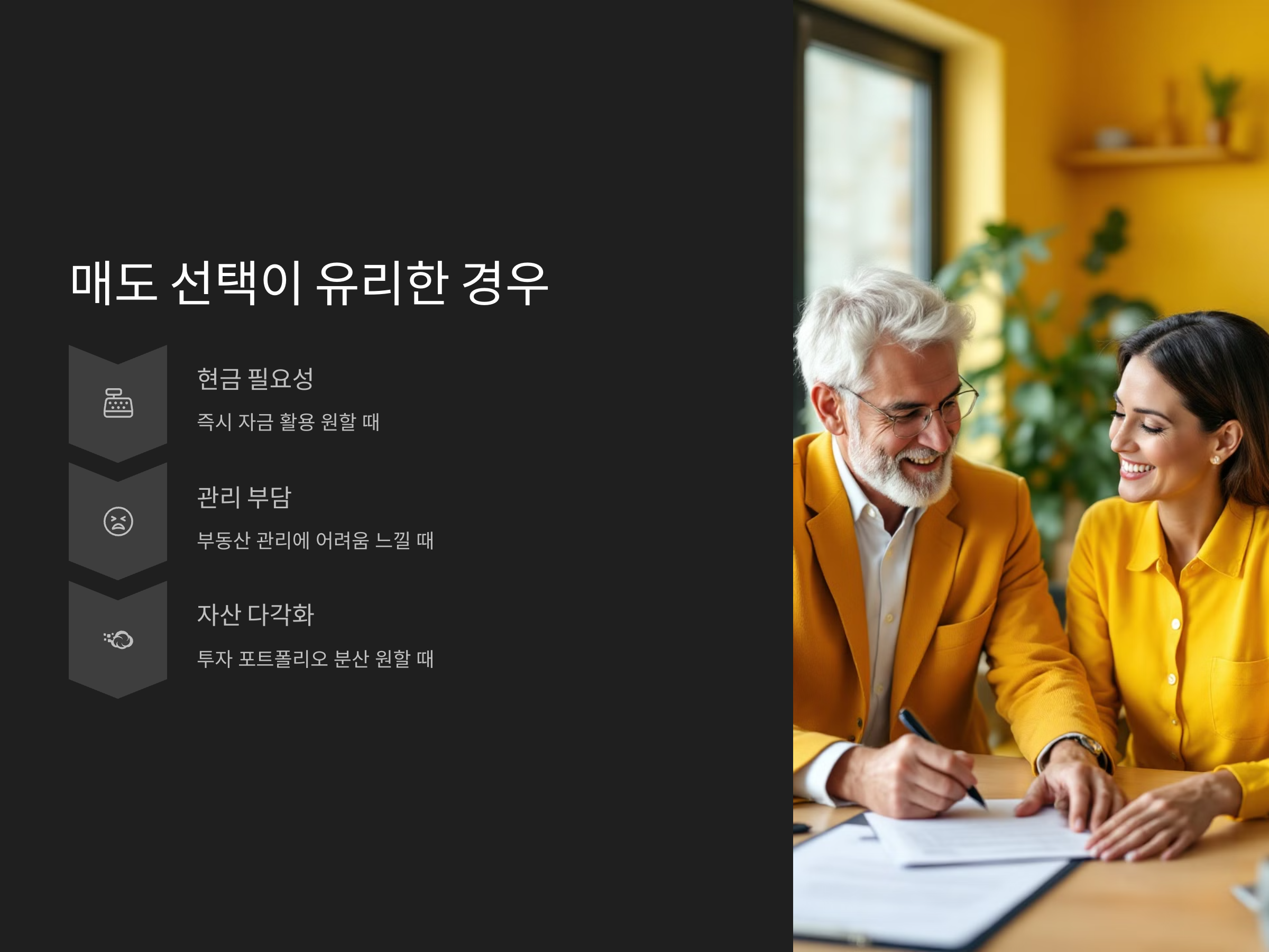 매도의 또 다른 장점은 부동산을 보유하고 있을 때 발생할 수 있는 관리 문제를 피할 수 있다는 것입니다. 특히 부동산을 여러 채 보유하고 있는 경우, 그 관리와 유지보수는 비용과 시간적인 면에서 부담이 될 수 있습니다. 매도를 통해 이러한 문제를 해결할 수 있는 점은 60대 이후의 생활에 더 많은 여유를 제공합니다.