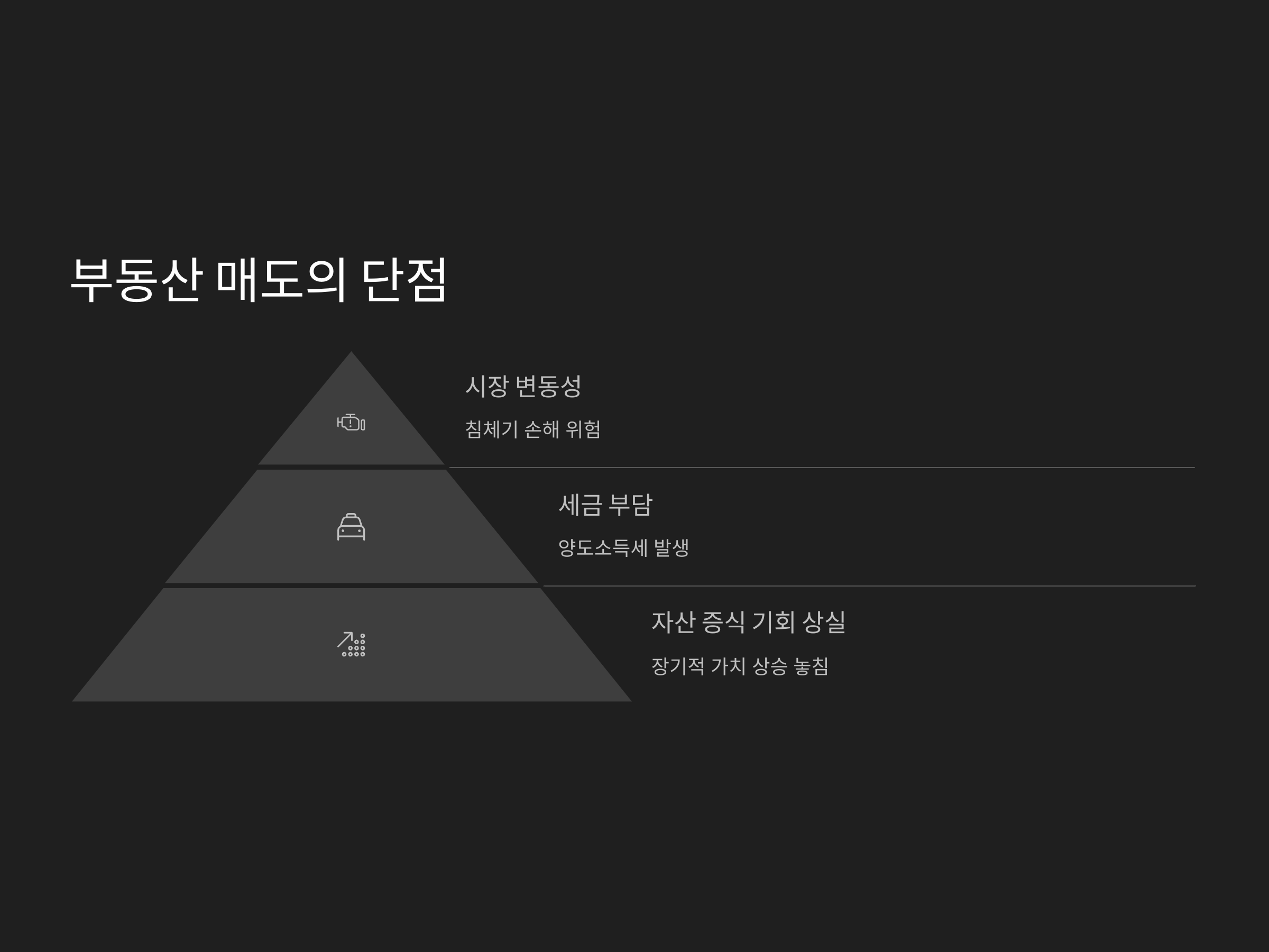 또한, 매도한 자산이 사라지게 되면 장기적인 자산 증식의 기회를 놓칠 수 있습니다. 매도 후 그 자금을 다른 곳에 투자하지 않는다면, 부동산이 제공하던 안정적인 자산 가치 상승을 놓칠 수 있습니다. 즉, 자산 가치 상승을 기대하고 보유할 경우와는 달리, 매도 후에는 시장 회복기에서 발생할 수 있는 자산 상승을 얻지 못하는 위험이 존재합니다.