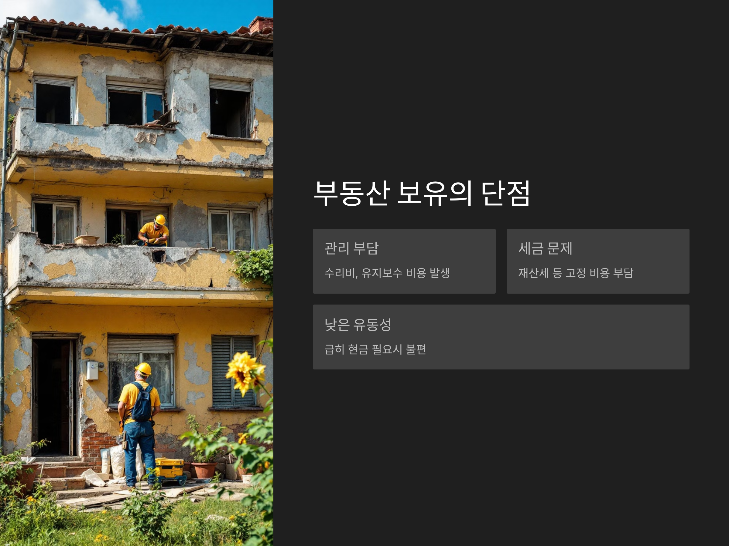 부동산 보유의 단점으로는 우선 관리와 세금 문제가 있습니다. 특히 오래된 부동산을 보유하고 있을 경우, 수리비와 유지보수 비용이 부담이 될 수 있습니다. 또한, 재산세와 같은 세금이 매년 발생하므로, 고정적인 비용 부담이 늘어날 수 있습니다. 이는 60대 이후의 고정적인 수입이 부족할 경우, 경제적 부담이 될 수 있습니다.