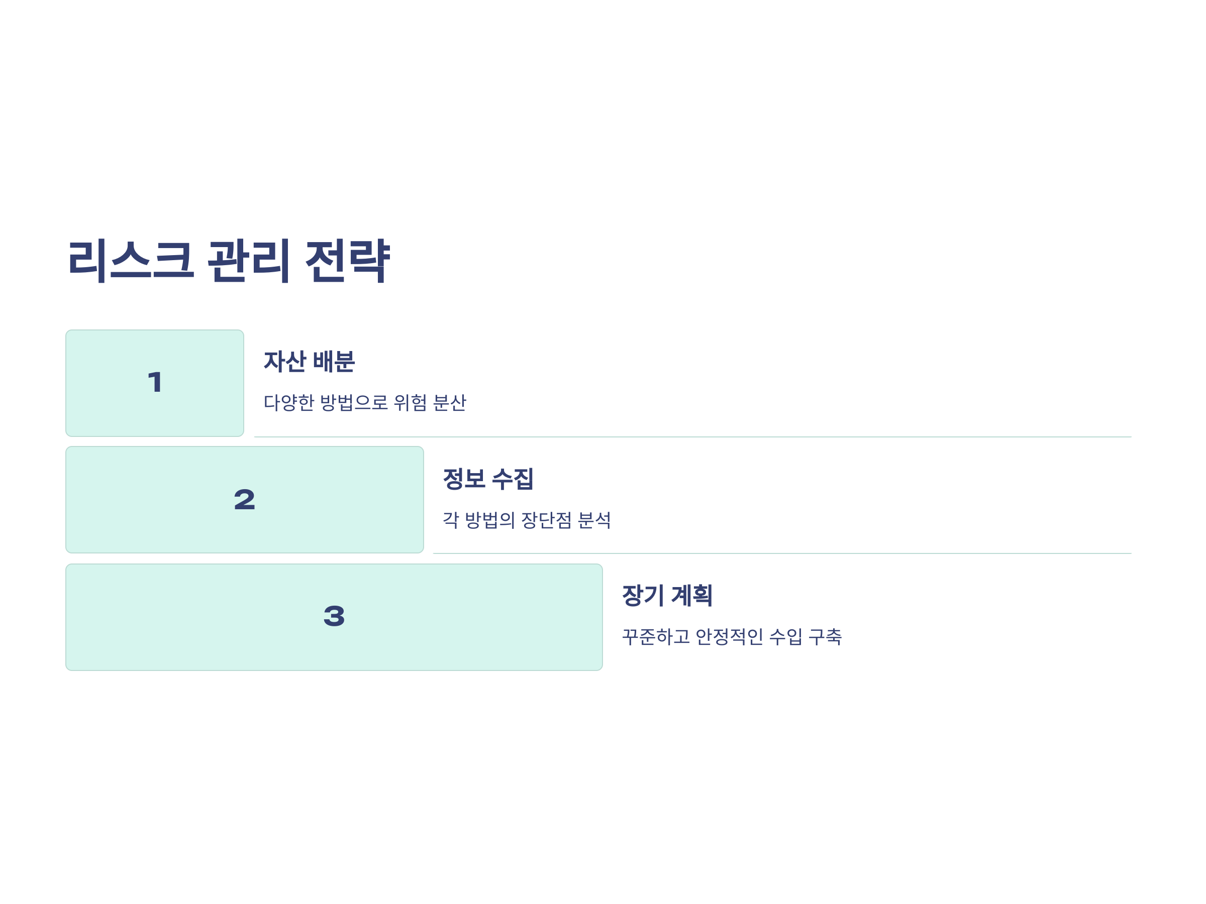 각각의 방법에 대해 충분히 분석하고 자신에게 맞는 전략을 세우는 것이 필요합니다. 또한, 초기 투자 자금을 어떻게 운용할지, 그리고 각 방법에 따르는 리스크를 어떻게 관리할지에 대해 심도 깊은 고민이 필요합니다. 무엇보다 중요한 것은 꾸준함과 장기적인 계획을 세우는 것입니다. 60대 이후에도 자신만의 안정적인 수입원 구축을 통해 행복한 노후를 준비할 수 있습니다.