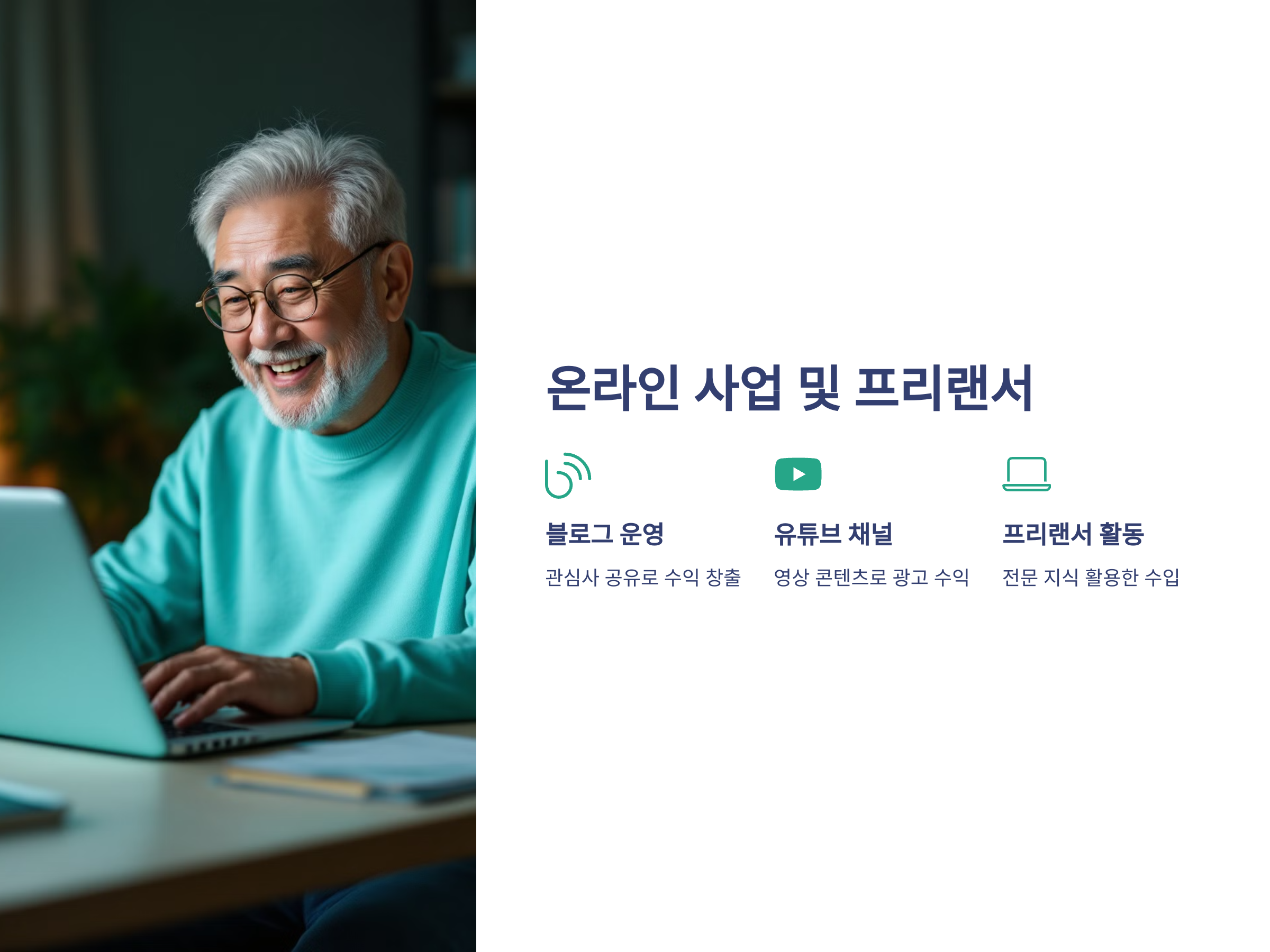 60대 이후에도 온라인 사업이나 프리랜서 활동을 통해 추가적인 수입을 올릴 수 있습니다. 예를 들어, 블로그 운영, 유튜브 채널 운영, 온라인 마케팅 등의 활동을 통해 수익을 창출할 수 있습니다. 이러한 방법은 처음 시작할 때 시간이 걸릴 수 있지만, 일단 안정된 수입 모델을 구축하면 꾸준한 현금 흐름을 만들 수 있습니다.