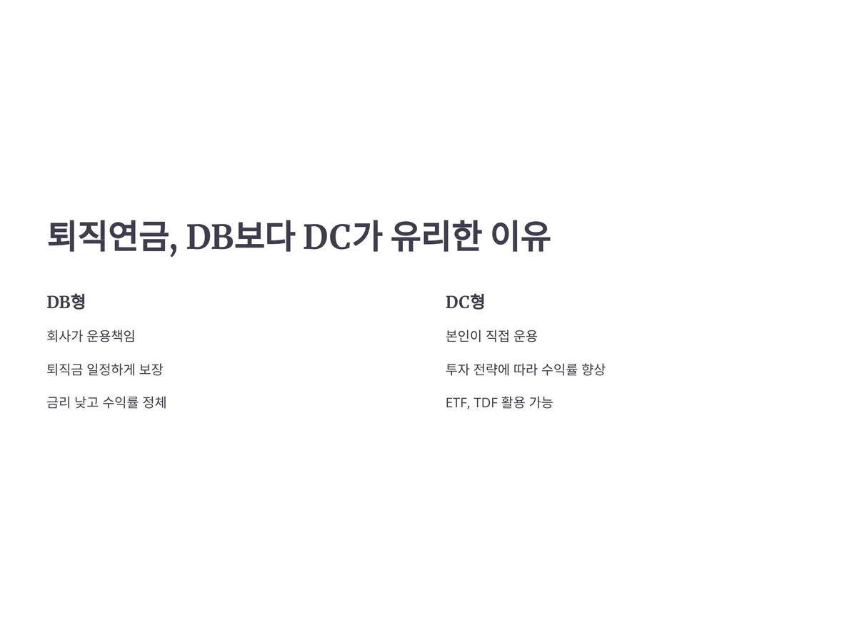 반면, DC형은 본인이 운용을 직접 하는 구조로, 투자 전략에 따라 수익률을 높일 수 있습니다. 최근 금리가 낮고 물가가 높은 시대에서는, 수동적인 DB형보다는 능동적인 DC형이 더 유리할 수밖에 없습니다.