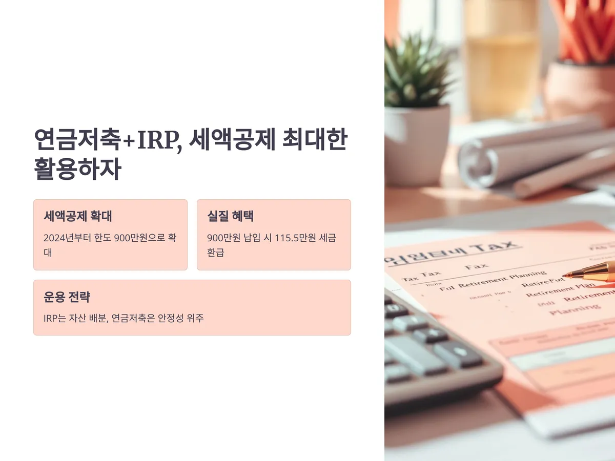 연금저축과 개인형 IRP는 현재 가장 '핫'한 노후 준비 수단입니다. 특히 2024년부터 세액공제 한도가 각각 900만원(IRP 포함 기준)으로 확대되며, 납입 유인이 매우 커졌습니다. 이는 중산층에게 매우 유리한 변화입니다.