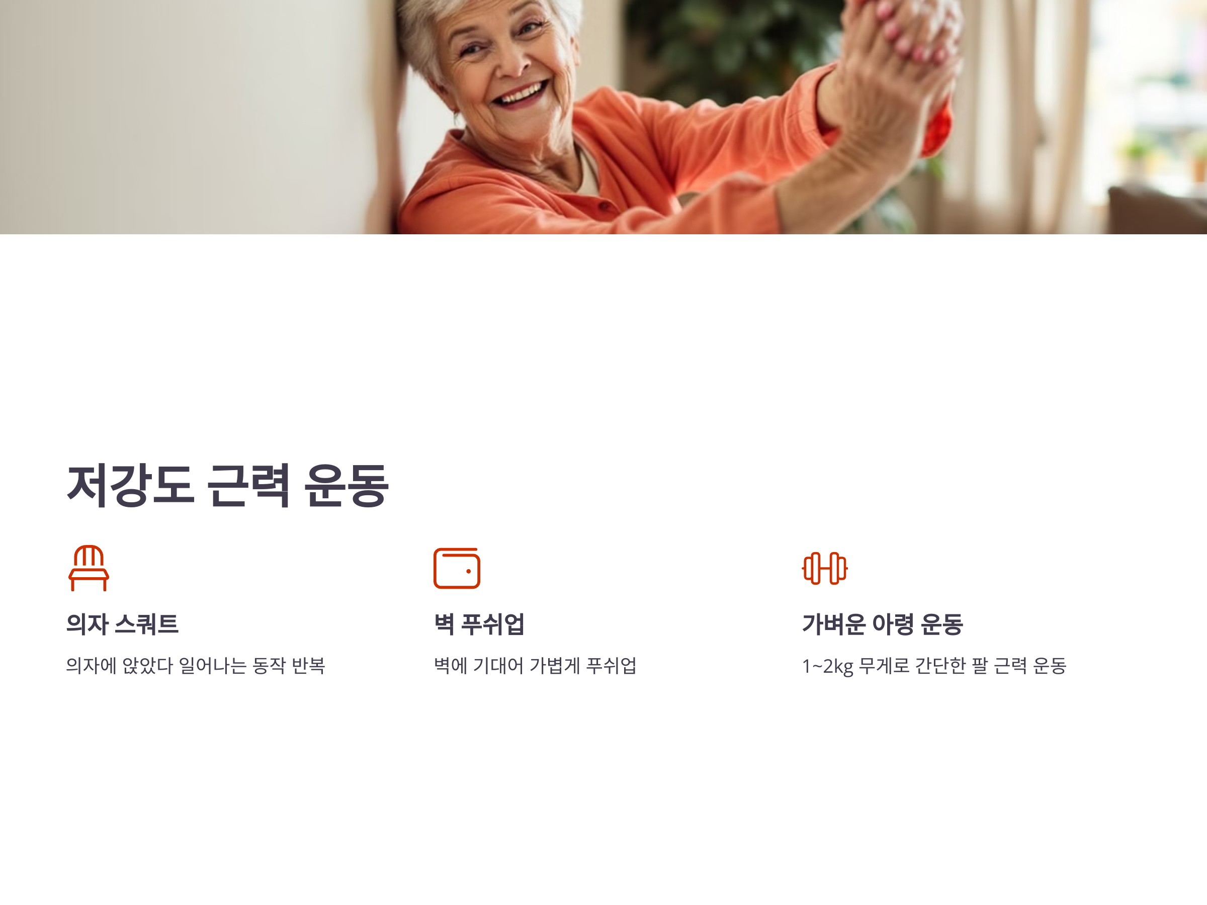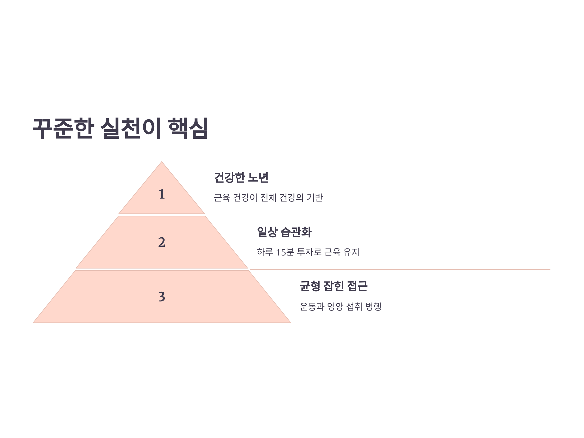 지금부터라도 작은 실천을 시작해 보세요. 근육이 건강해야 몸 전체가 건강합니다. 오늘부터 하루 15분 투자하여 근육을 지켜보세요!