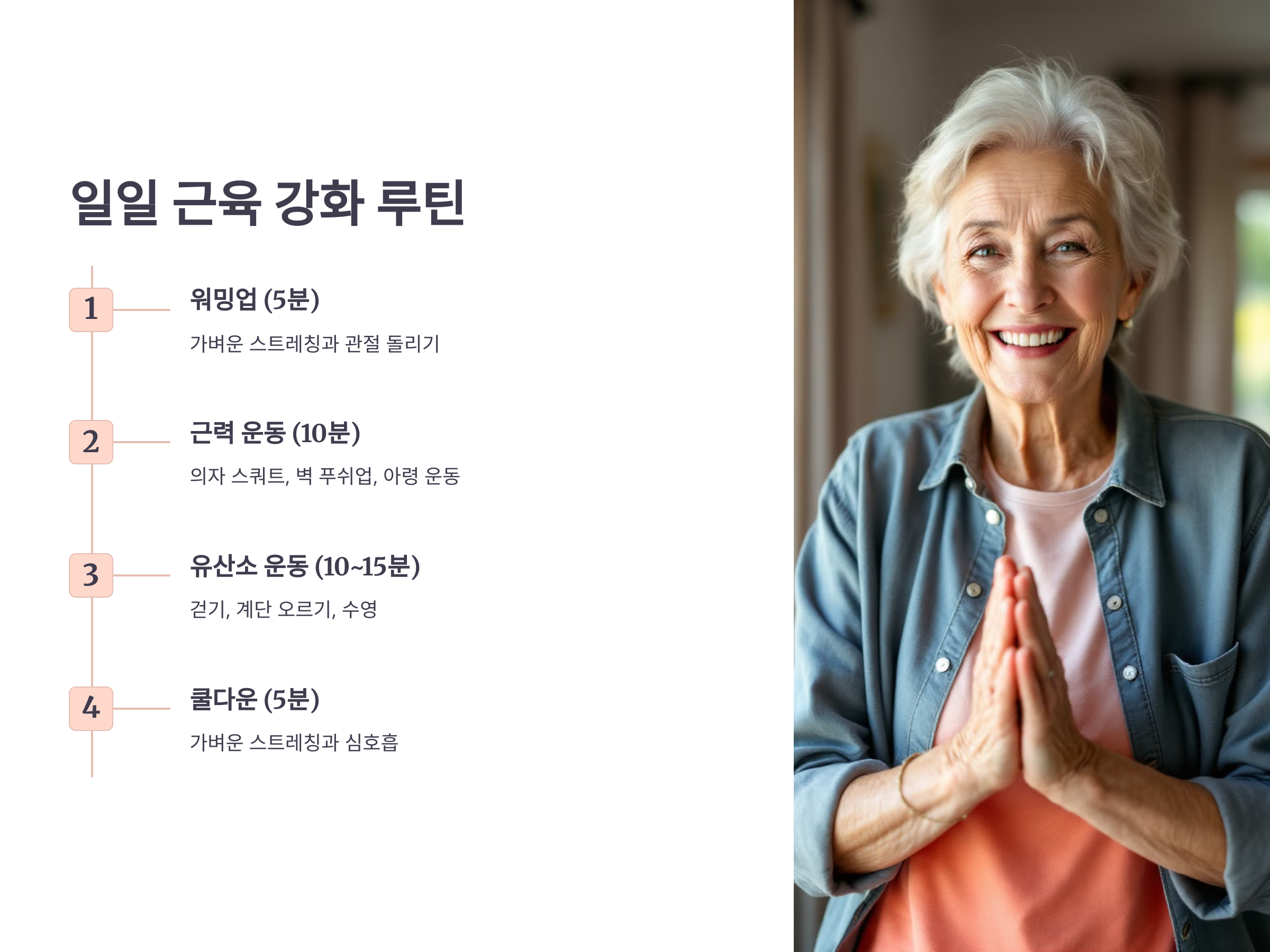 - 가벼운 걷기: 하루 30분 이상 가볍게 걷는 것만으로도 근육 유지에 효과적입니다.