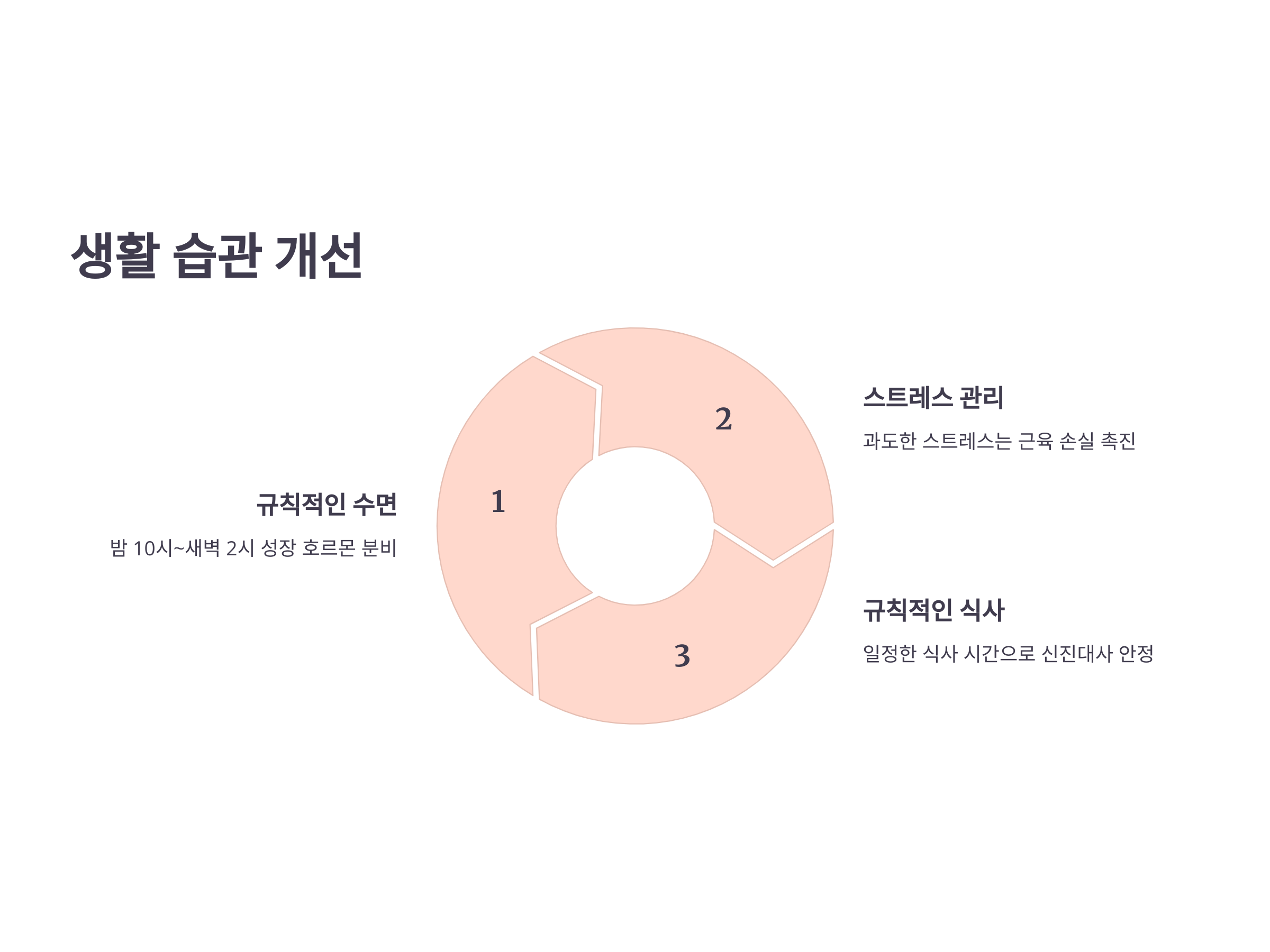 - 스트레스 관리: 과도한 스트레스는 근육 손실을 촉진할 수 있습니다.