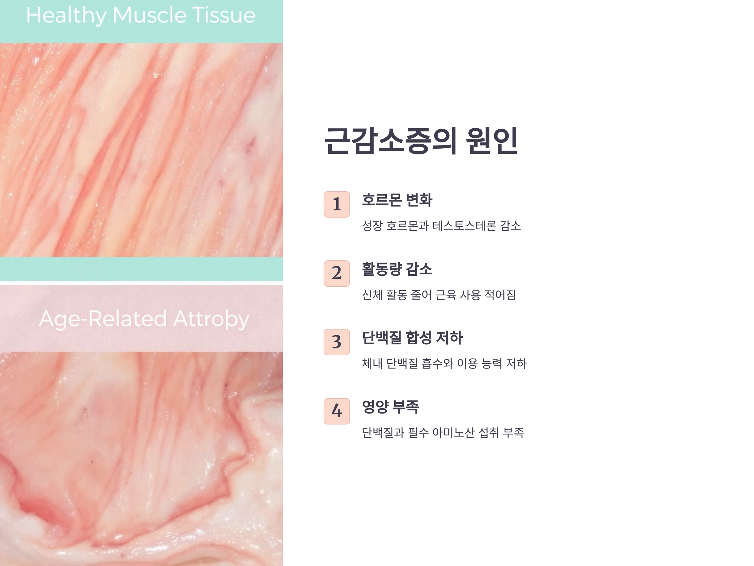 - 단백질 합성 저하: 노화로 인해 체내 단백질 흡수와 이용 능력이 떨어집니다.