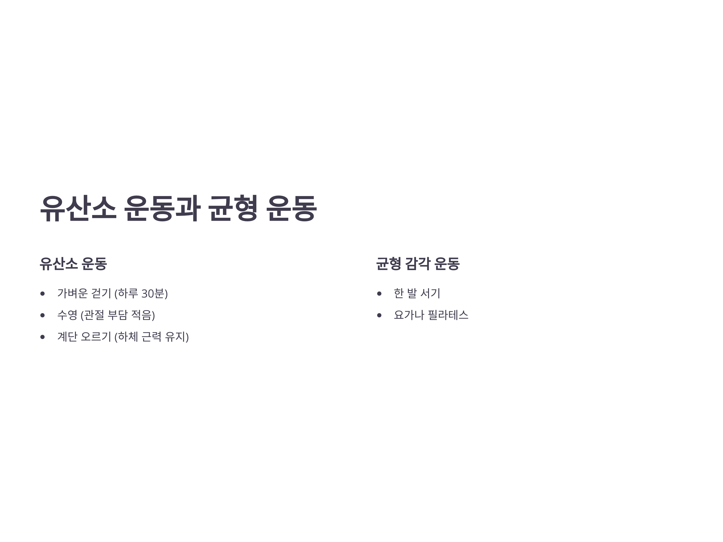 - 요가나 필라테스: 유연성과 근력을 동시에 기를 수 있습니다.