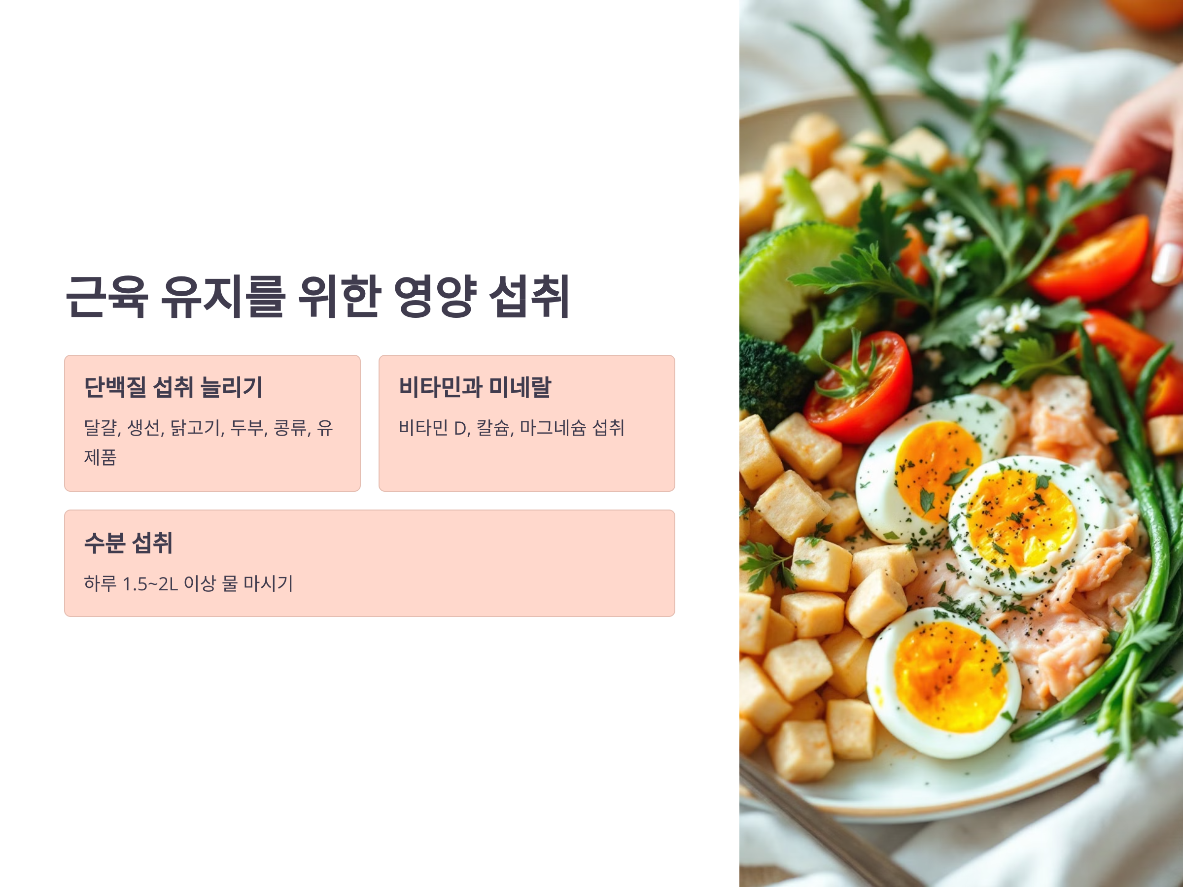 - 비타민 D: 근육과 뼈 건강을 위해 필수적 (햇볕을 쬐거나 보충제로 섭취)