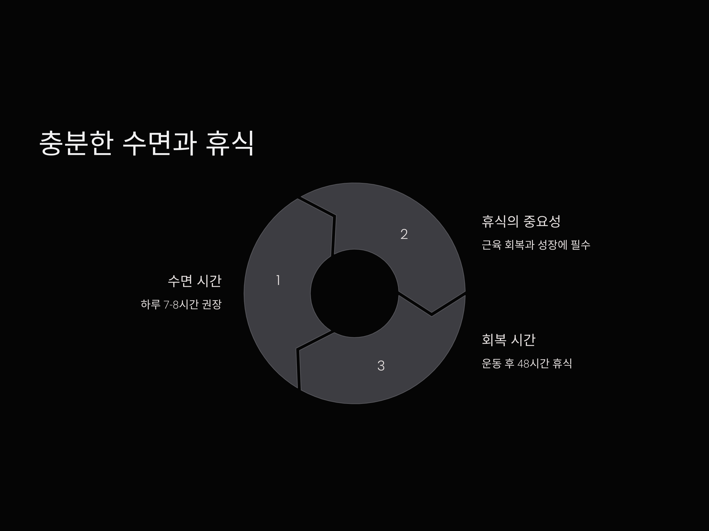 수면은 근육 회복과 성장에 중요한 역할을 합니다. 하루에 최소 7~8시간의 수면을 취하는 것이 좋습니다. 수면 중에 분비되는 성장 호르몬은 근육 회복과 성장을 돕기 때문에, 수면의 질을 높이는 것이 중요합니다.