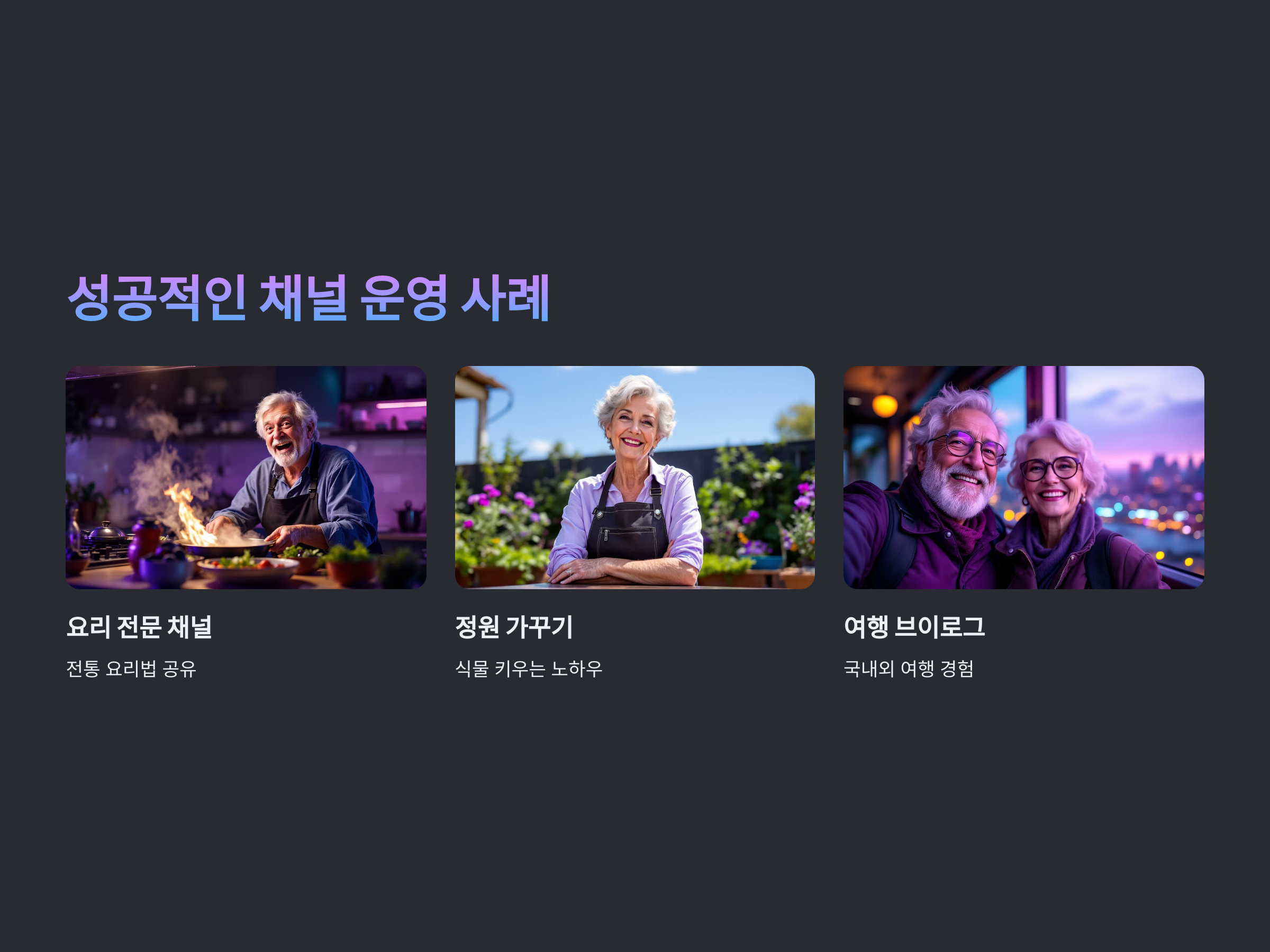 특히 70대 이상의 유튜버라면, 더 친근하고 인간적인 매력을 발산할 수 있습니다. 구독자들은 그와 같은 나이대의 유튜버에게 더욱 친밀감을 느낄 수 있기 때문에, 나만의 독특한 스타일로 소통을 한다면 더욱 큰 인기를 끌 수 있습니다.