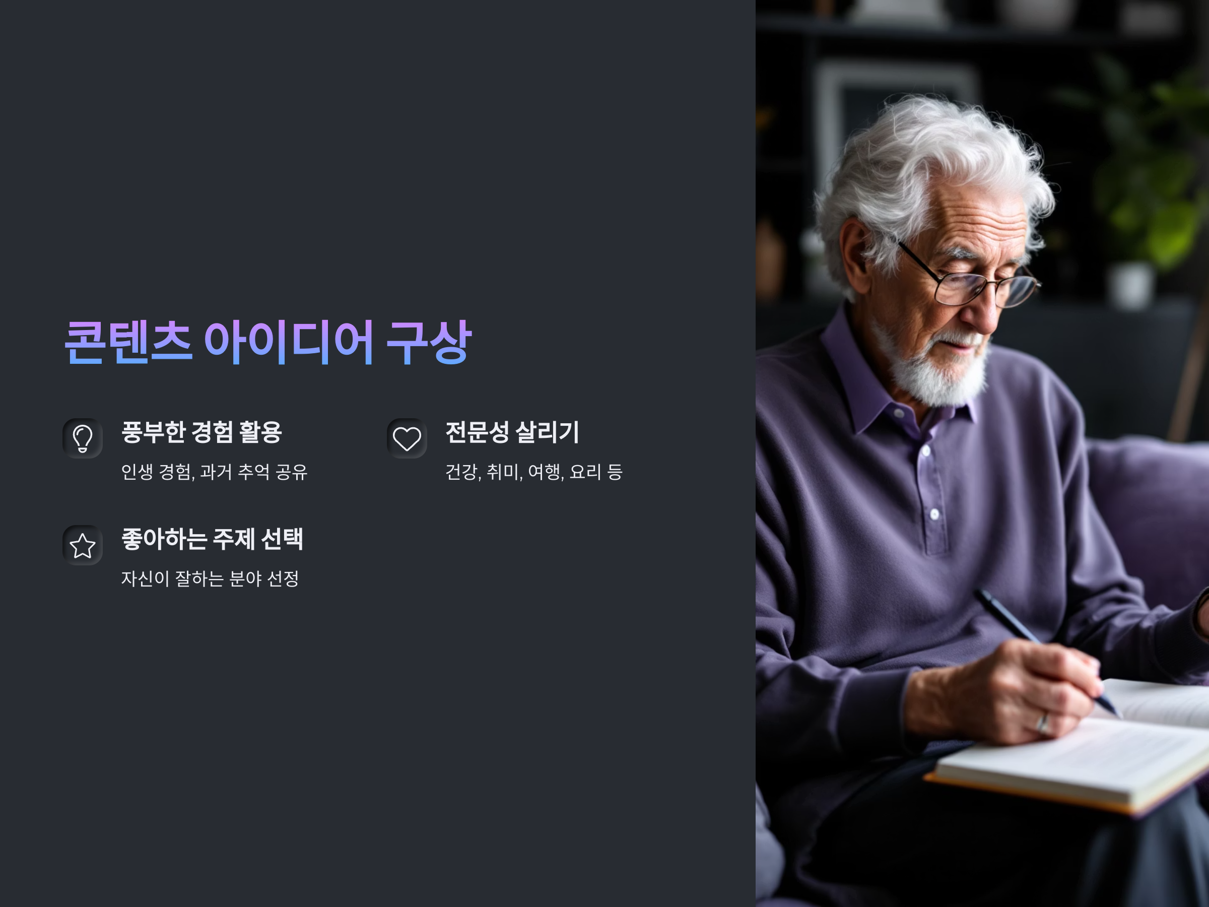 유튜브를 시작하는 첫 번째 단계는 콘텐츠 아이디어를 구상하는 것입니다. 70대 이상이라면, 젊은 사람들과는 다른, 풍부한 경험과 지혜를 바탕으로 고유한 콘텐츠를 만들 수 있습니다. 예를 들어, 인생 경험을 나누거나, 과거의 추억을 돌아보는 콘텐츠는 많은 사람들이 공감할 수 있는 주제가 될 수 있습니다. 또한, 건강 관리, 취미 생활, 여행, 요리 등 다양한 분야에서 자신만의 전문성을 살려 콘텐츠를 제작할 수 있습니다. 중요한 점은, 자신이 좋아하고 잘할 수 있는 주제를 선택하는 것입니다.
