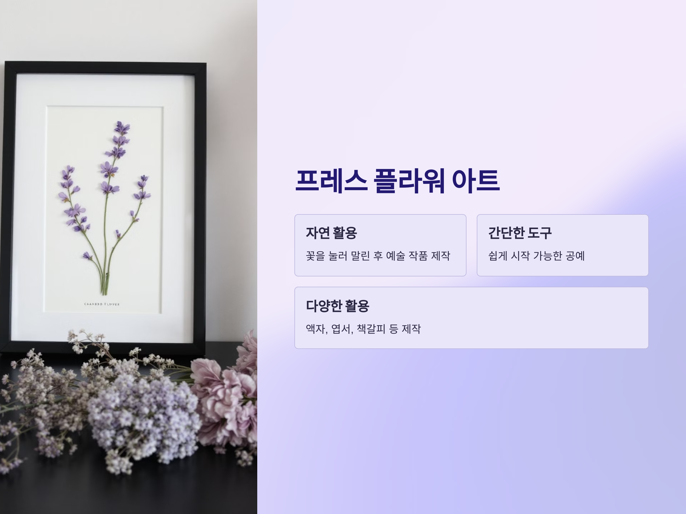 프레스 플라워 아트는 꽃을 눌러 말린 후 이를 이용해 다양한 예술 작품을 만드는 공예 활동입니다. 액자나 엽서, 책갈피 등에 활용할 수 있으며, 자연의 아름다움을 오랫동안 간직할 수 있다는 점에서 많은 사랑을 받고 있습니다.