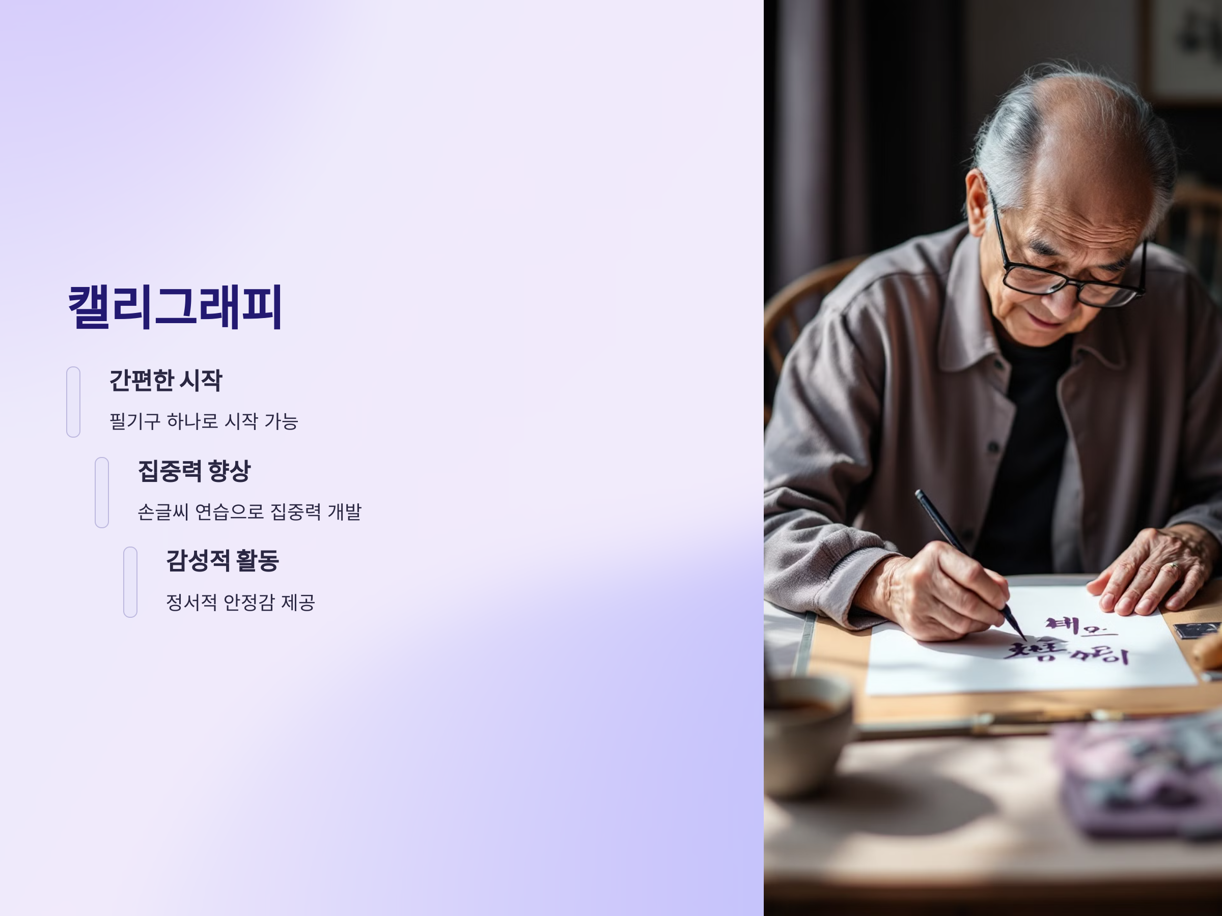 캘리그래피는 손글씨를 예술적으로 표현하는 활동으로, 필기구 하나만 있으면 어디서든 시작할 수 있습니다. 단순한 연습을 통해 글씨체를 꾸준히 발전시킬 수 있으며, 예쁜 문구나 명언을 적어 카드나 액자로 활용할 수도 있습니다.