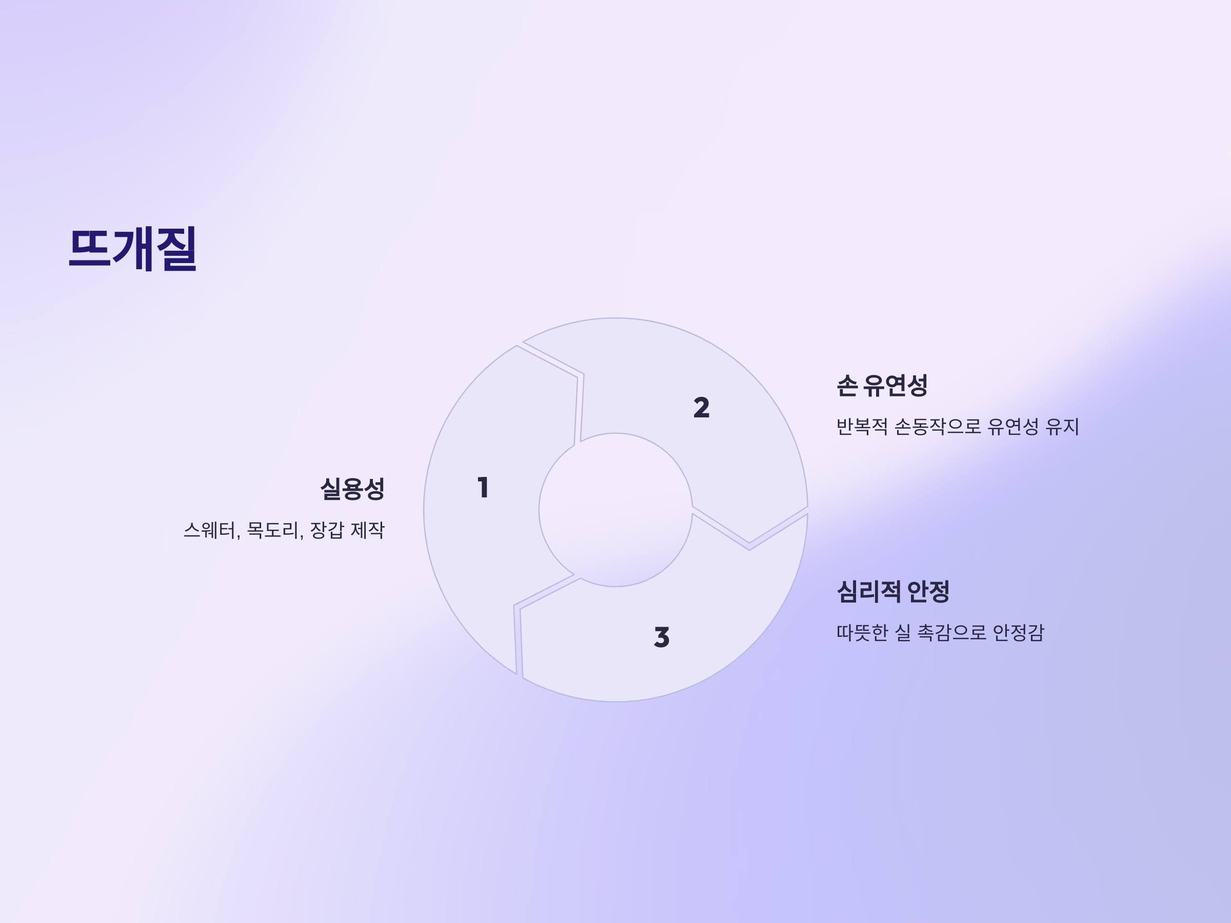 뜨개질은 반복적인 손동작을 통해 집중력을 높이고, 손의 유연성을 유지하는 데 도움이 됩니다. 또한, 따뜻한 질감의 실을 만지며 안정감을 느낄 수 있어 심리적으로도 긍정적인 영향을 줍니다.