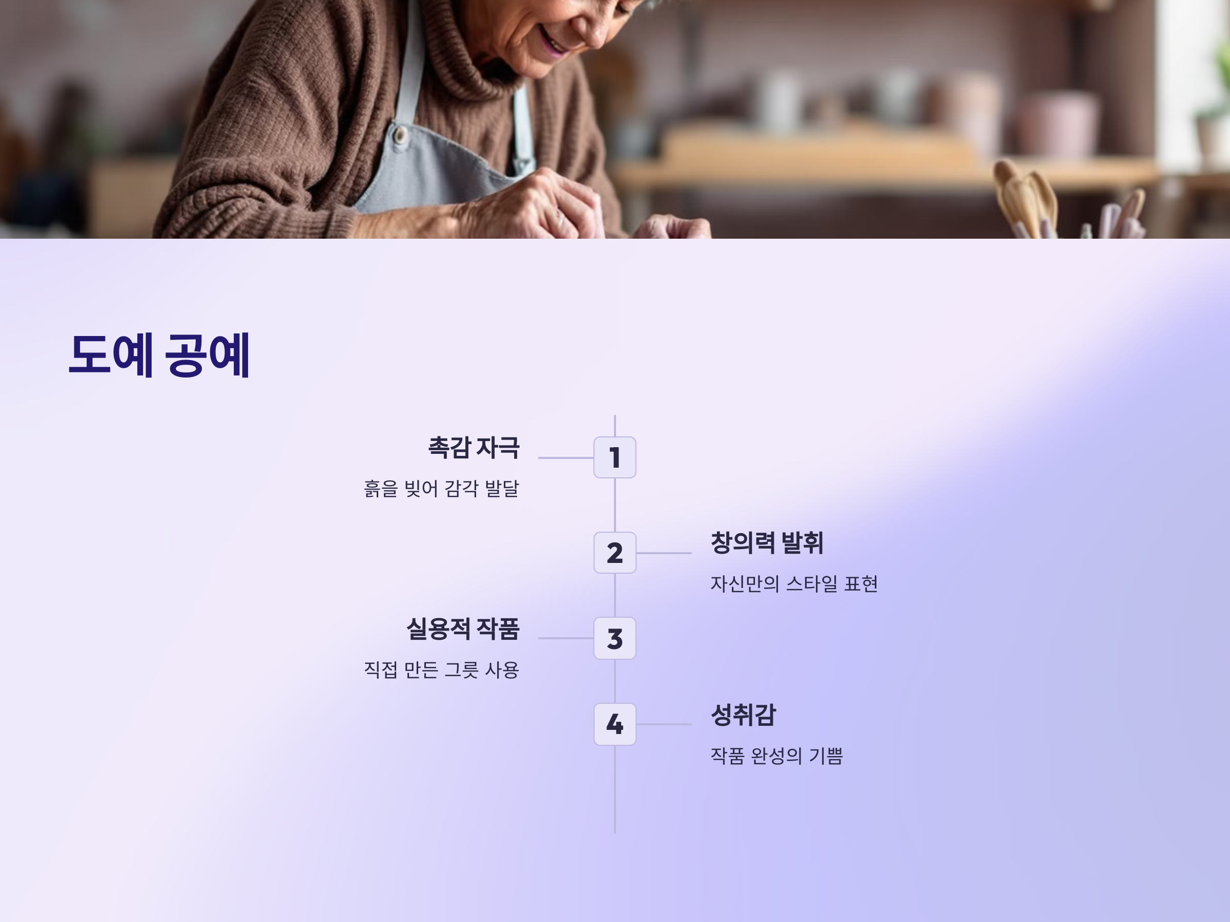 도예 공예는 손으로 직접 흙을 만지며 집중력을 기를 수 있고, 작품을 완성했을 때의 성취감이 큽니다. 또한, 직접 만든 그릇을 일상에서 사용할 수 있어 실용성도 뛰어납니다.