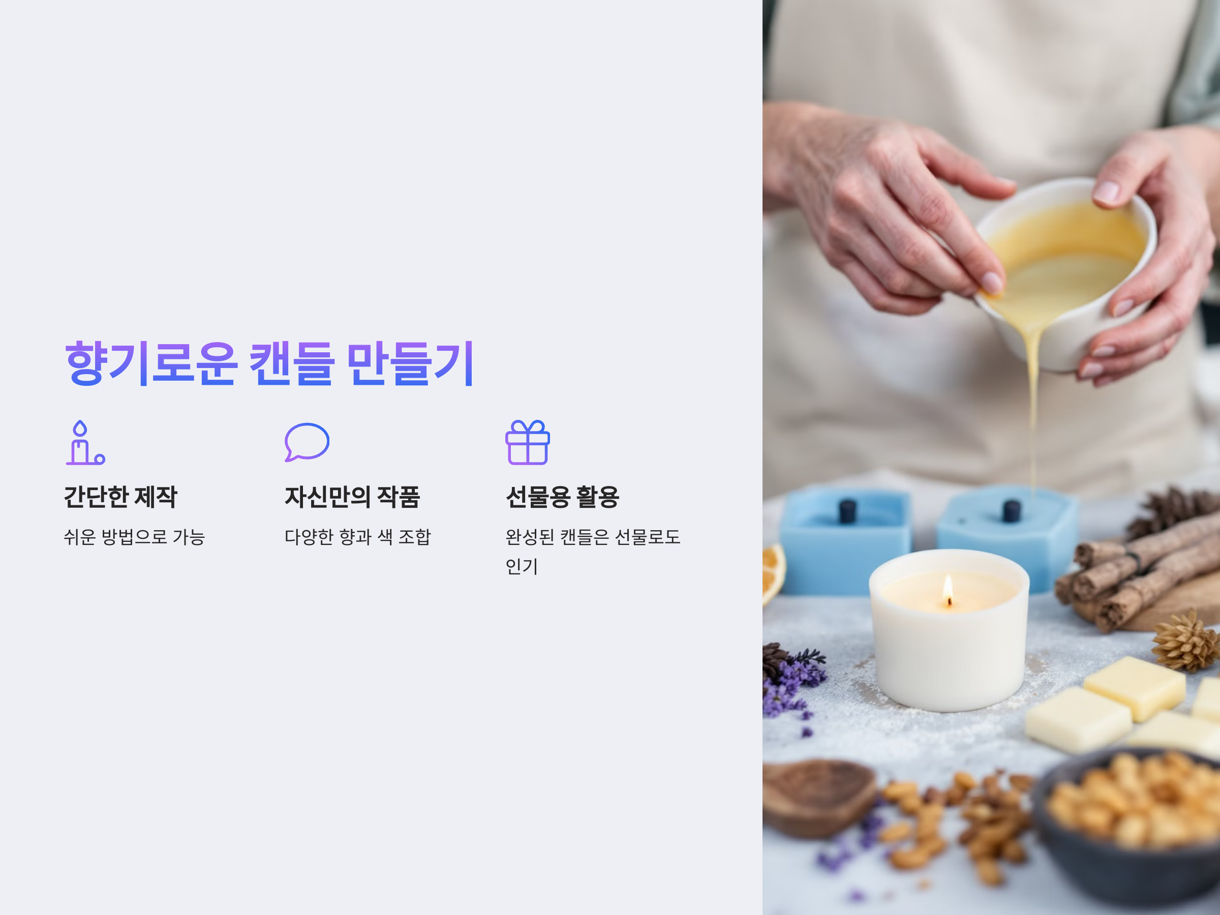 - 다양한 향과 색을 조합해 자신만의 캔들 제작