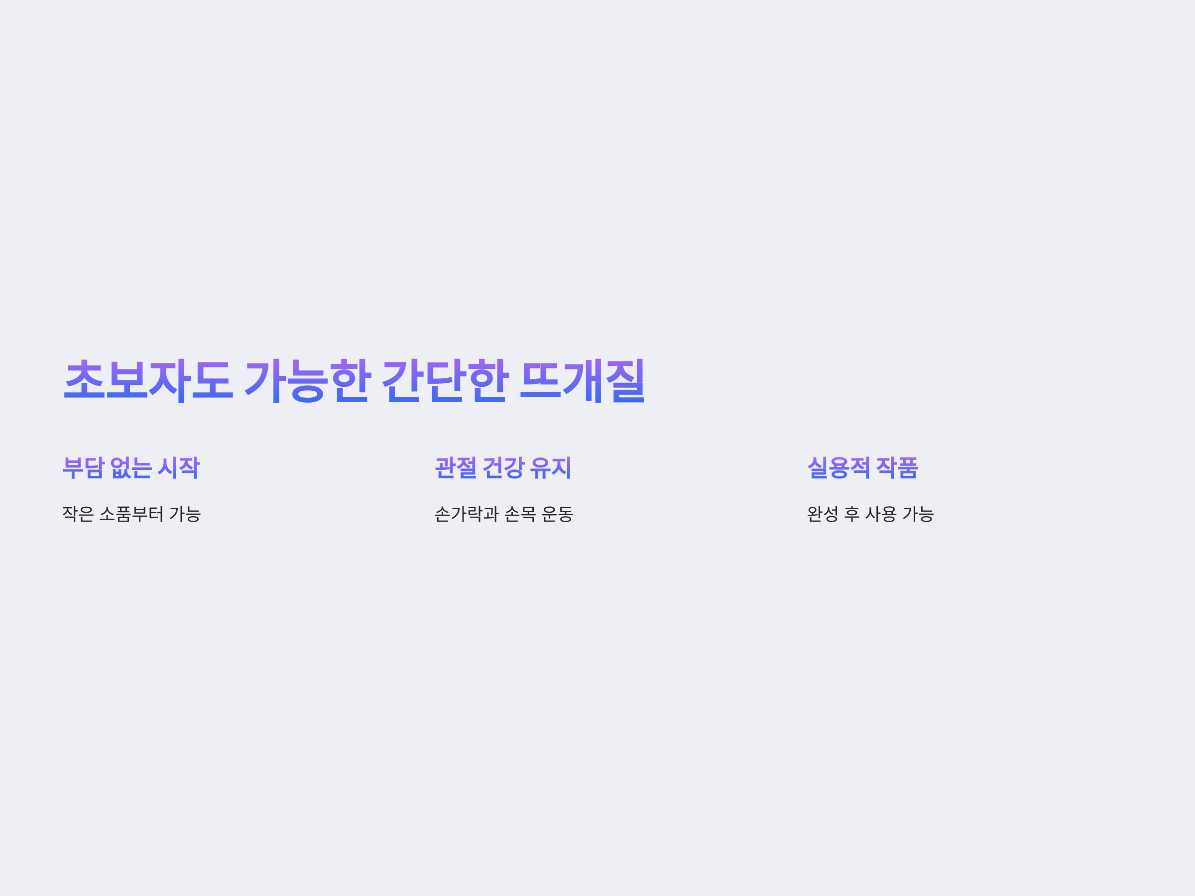 뜨개질은 비교적 간단한 방법으로도 실생활에서 유용한 작품을 만들 수 있는 공예입니다. 특히 손을 자주 움직이게 하여 혈액순환에 도움이 되며, 집중력을 기르는 데에도 좋습니다.