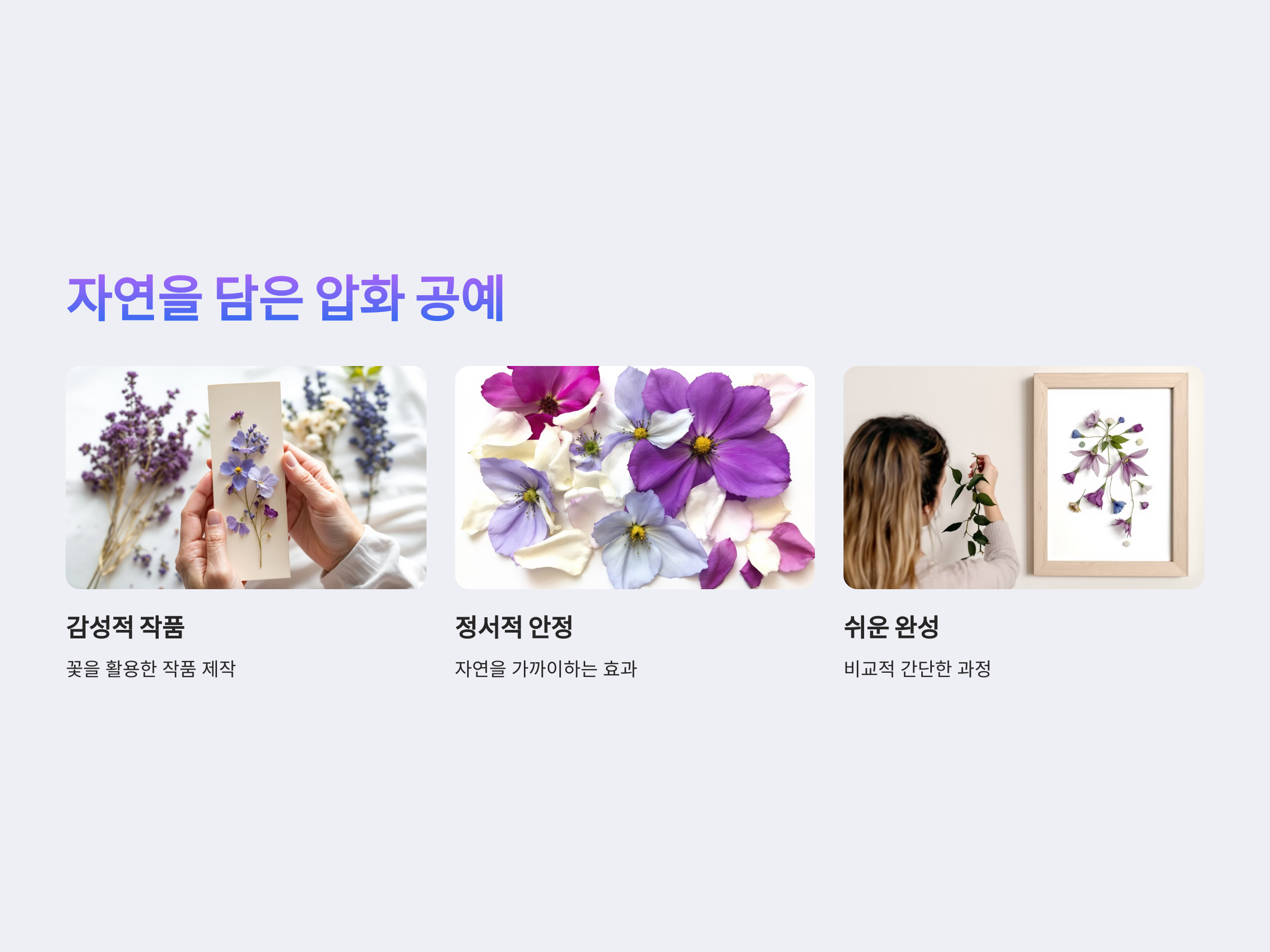 압화 공예는 꽃을 눌러 말린 후 엽서, 액자, 책갈피 등에 활용하는 방법으로, 자연의 아름다움을 오래 간직할 수 있는 공예입니다.