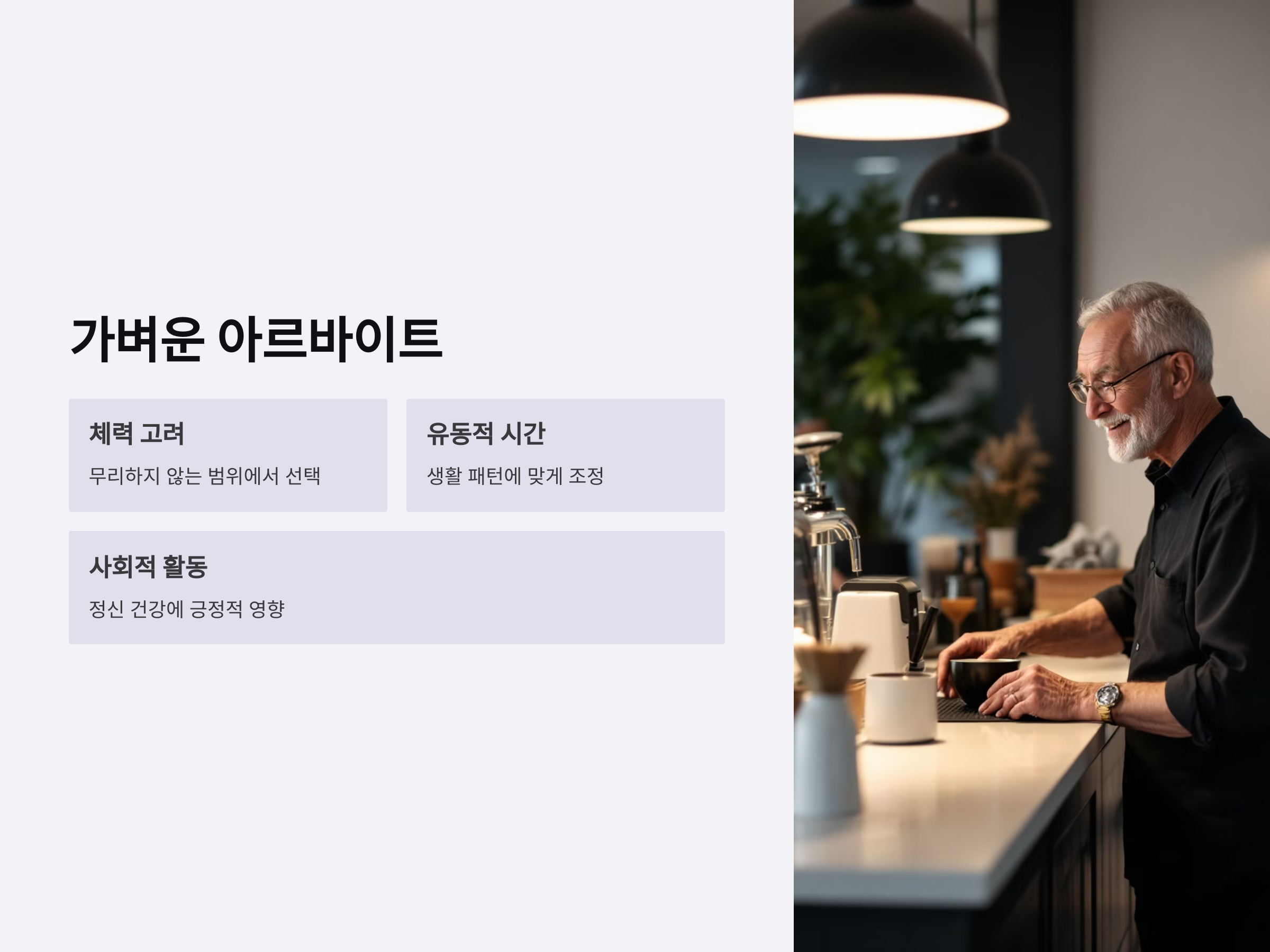 자신의 건강 상태를 고려해 무리하지 않도록 조정하면서, 경제적인 부담을 덜 수 있습니다. 또한, 사회적 활동을 할 수 있기 때문에 정신적인 건강에도 긍정적인 영향을 미칠 수 있습니다.