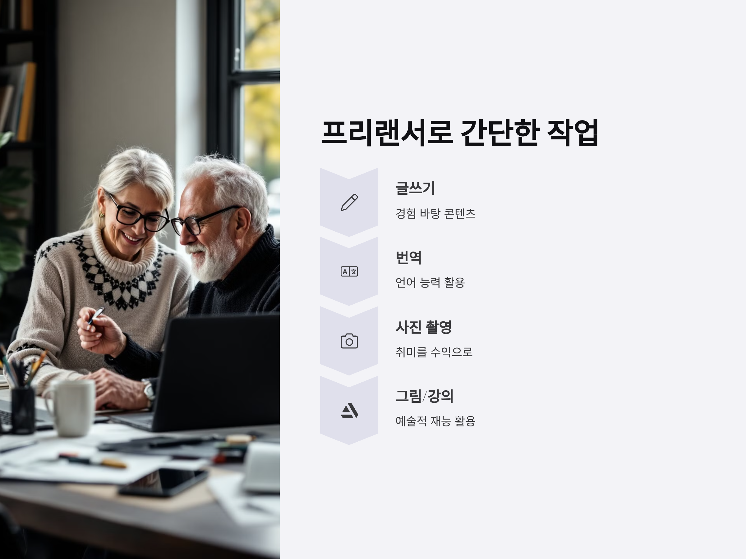 프리랜서 플랫폼에서는 연령에 상관없이 누구나 자신만의 전문성을 발휘할 수 있는 기회를 제공하고 있습니다. 자신의 특기를 살려 온라인 플랫폼에서 다양한 일을 찾을 수 있기 때문에 추가 소득을 만들기 위해 도전해보세요.
