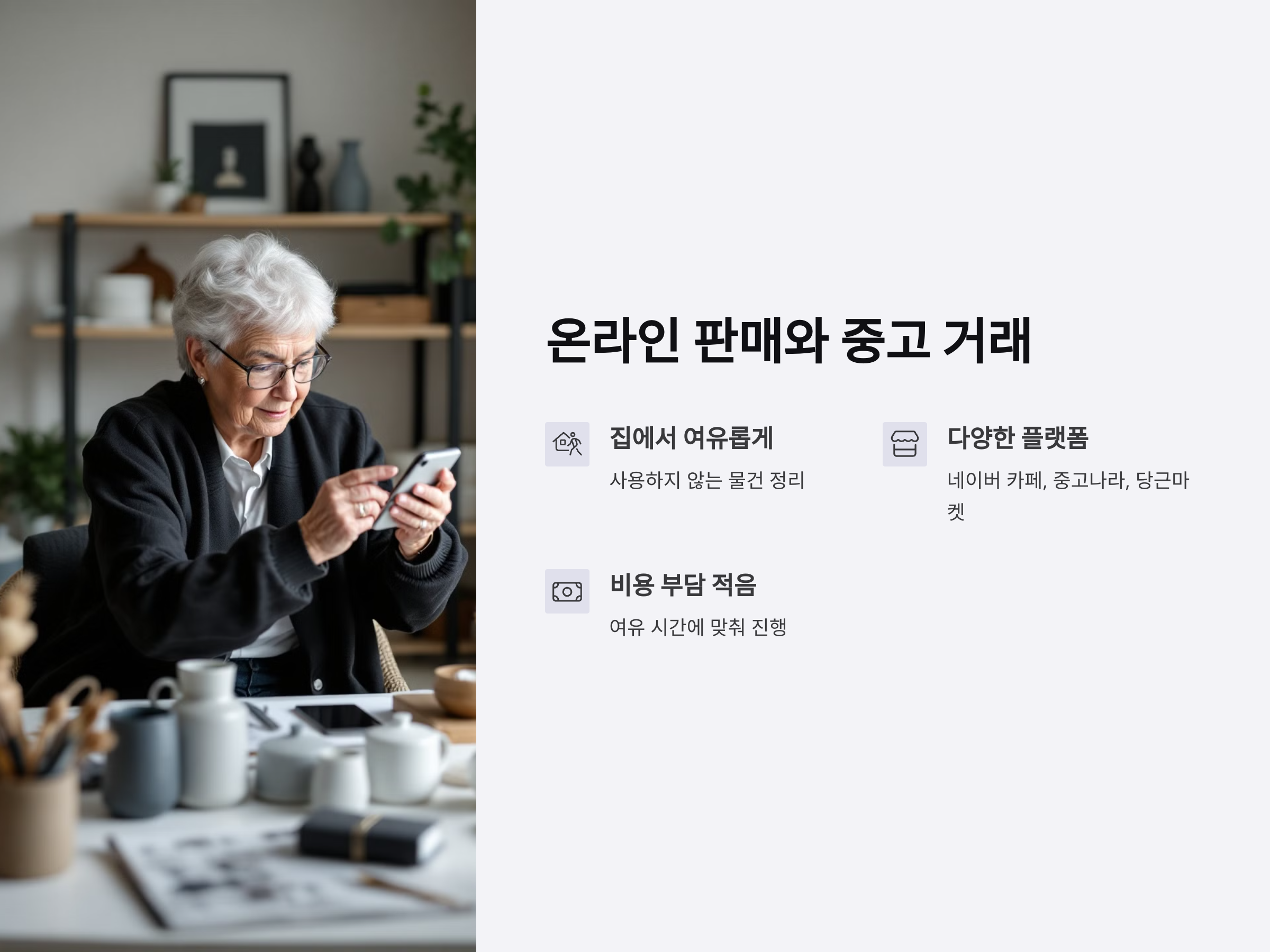 온라인 판매는 많은 연령대가 쉽게 접근할 수 있는 수단입니다. 특히 70대 연금 생활자들이 집에서 여유롭게 할 수 있는 활동 중 하나입니다. 집에서 더 이상 사용하지 않는 물건을 정리하고, 중고 물품을 온라인에서 판매해 보세요. 최근에는 네이버 카페나 중고나라, 당근마켓 등의 플랫폼에서 매우 활발한 거래가 이루어지고 있습니다.