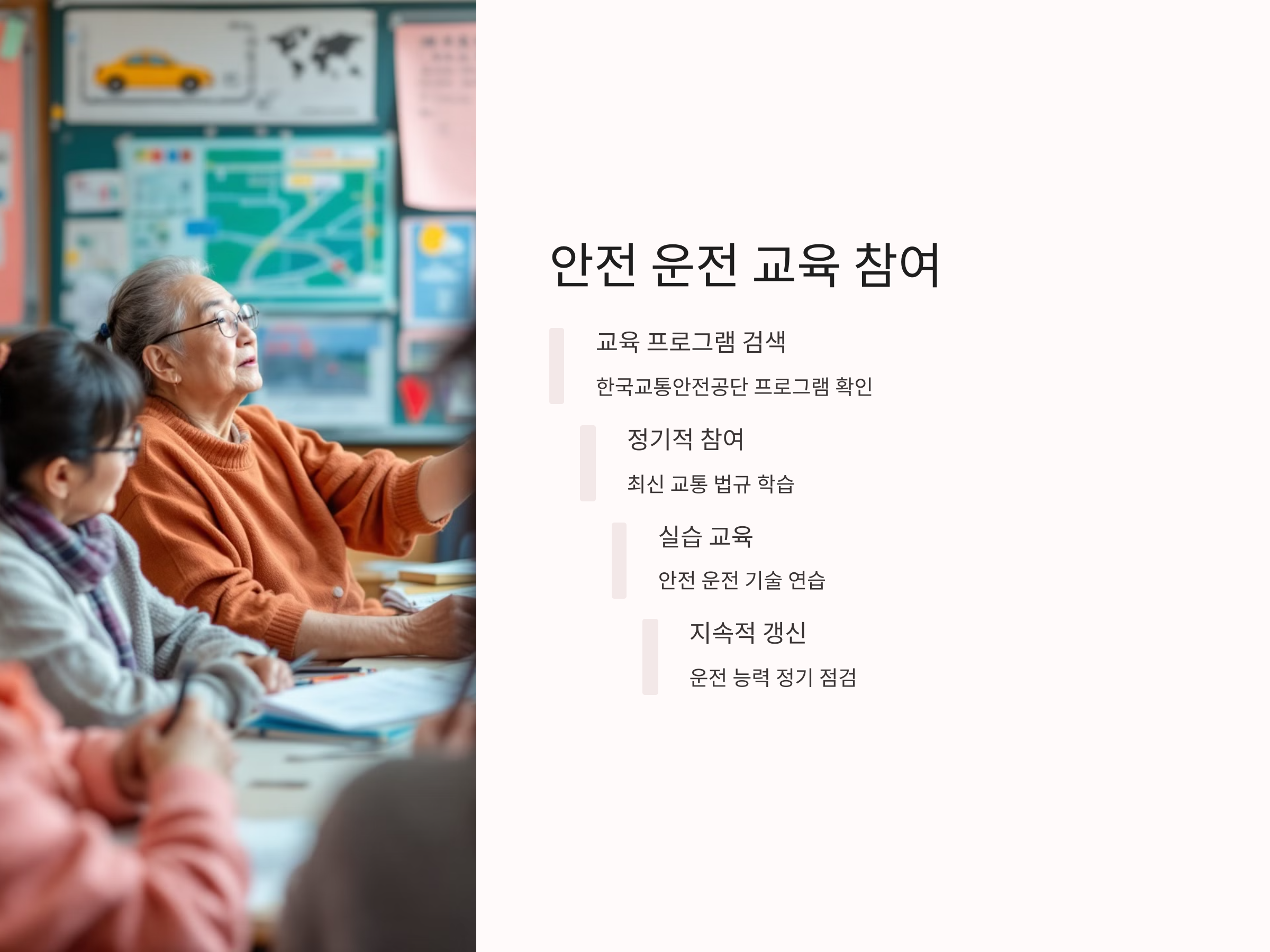 운전 기술은 시간이 지나면서 저하될 수 있으며, 교통 법규도 변경될 수 있습니다. 따라서 정기적으로 운전 교육 프로그램에 참여하여 최신의 교통 법규와 안전 운전 기술을 익히는 것이 중요합니다. 한국교통안전공단에서 운영하는 고령 운전자 교육 프로그램은 이러한 필요를 충족시키는 데 큰 도움이 됩니다. citeturn0search18