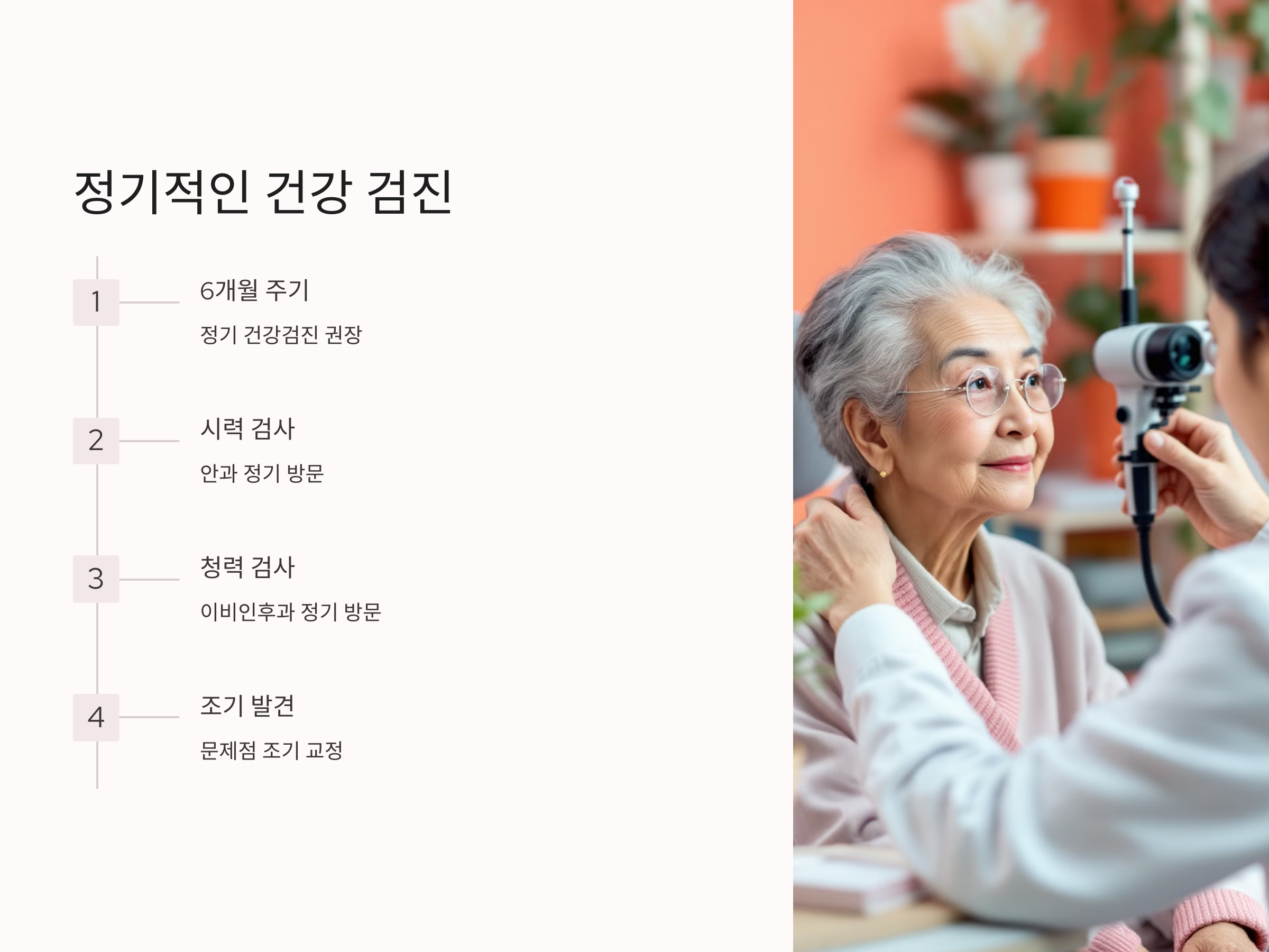 운전에 있어 시력과 청력은 매우 중요합니다. 고령 운전자는 최소 6개월에 한 번씩 건강검진을 받는 것이 좋습니다. 특히, 시력과 청력의 저하는 운전 시 위험 요소가 될 수 있으므로, 정기적인 안과 및 이비인후과 검진을 통해 이러한 문제를 조기에 발견하고 교정하는 것이 필요합니다. citeturn0search9