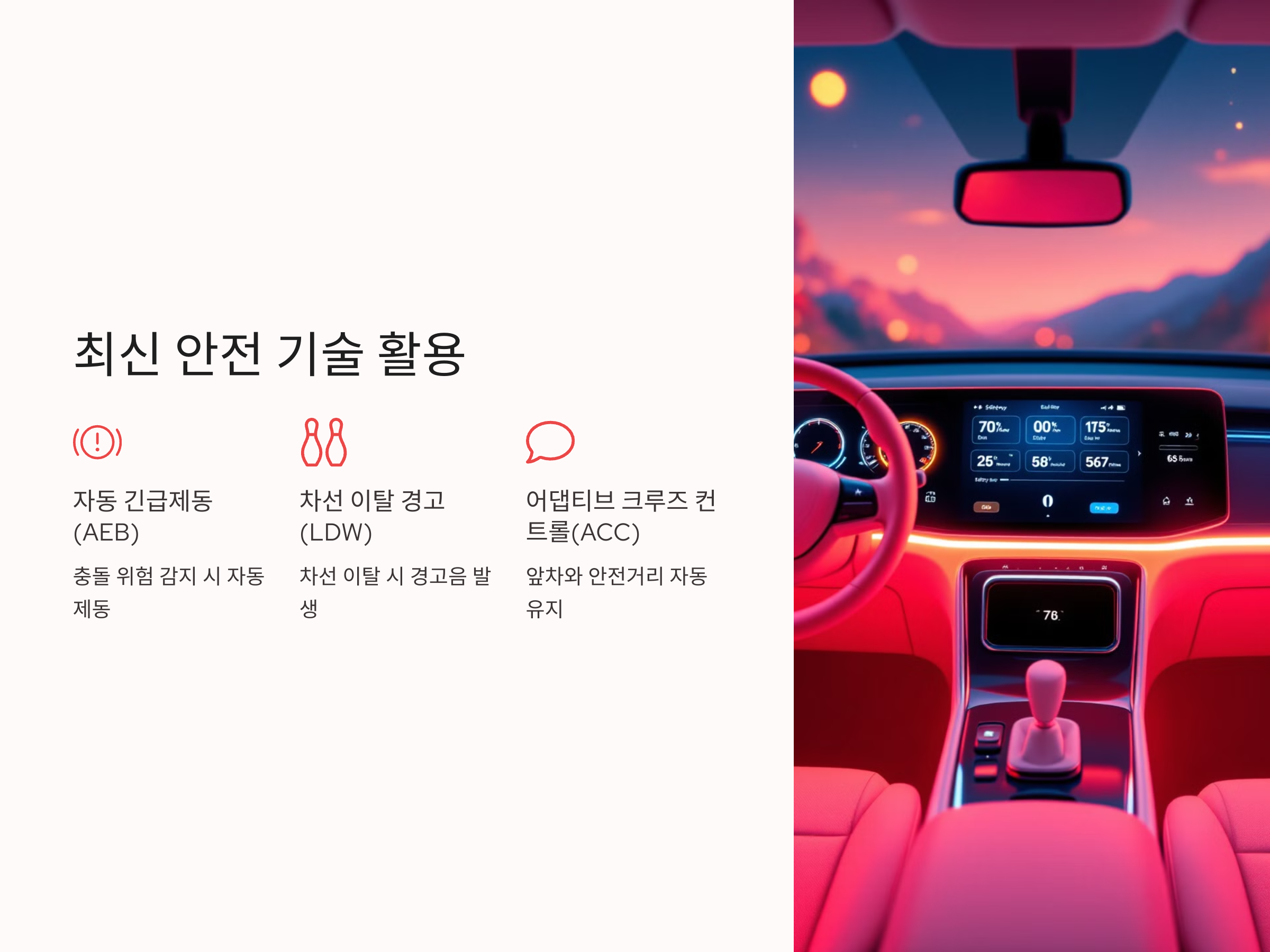 최신 차량들은 고령 운전자를 위한 다양한 안전 기능을 제공합니다. 예를 들어, 자동 긴급제동시스템(AEB), 차선 이탈 경고(LDW), 어댑티브 크루즈 컨트롤(ACC) 같은 기술은 운전자의 안전을 크게 향상시킬 수 있습니다. 이러한 기술들은 특히 반응 속도가 느려진 고령 운전자에게 매우 유용합니다. citeturn0search5