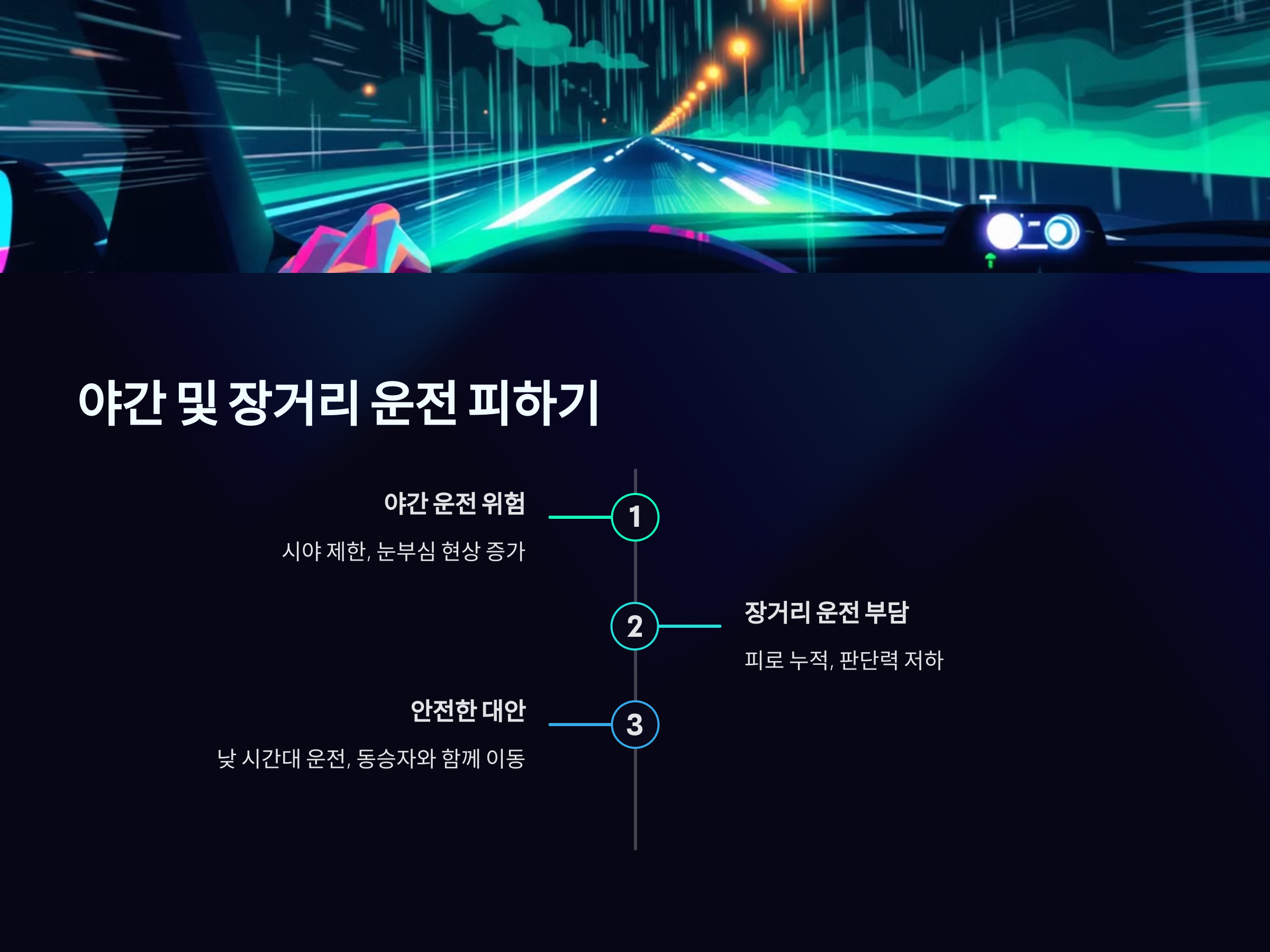 야간과 장거리 운전은 신체적으로 큰 부담을 줄 수 있으므로 가급적 피하는 것이 좋습니다.