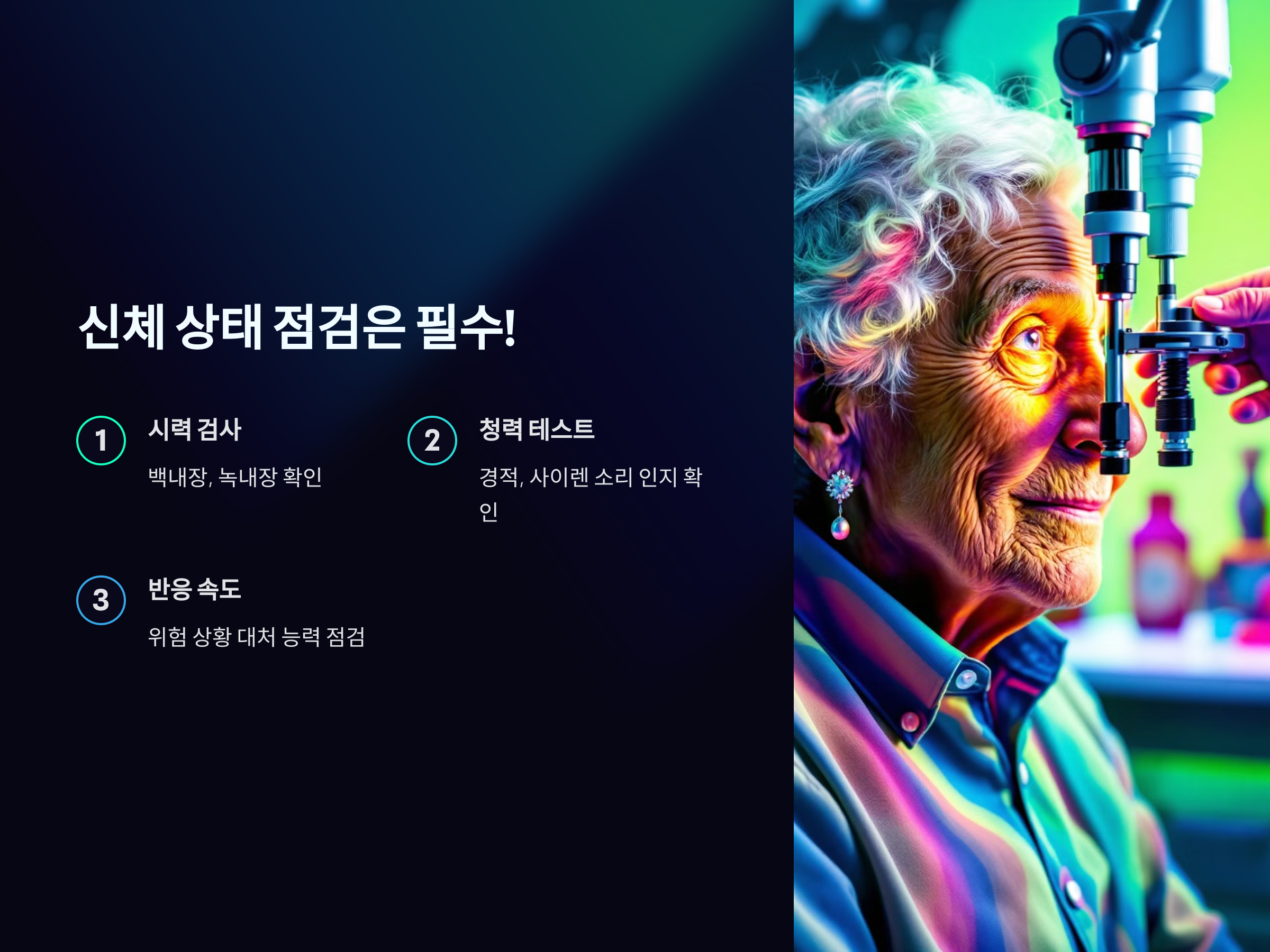 - 청력 테스트: 경적 소리나 사이렌 소리를 명확히 들을 수 있는지 체크하고, 필요하다면 보청기 사용을 고려해야 합니다.