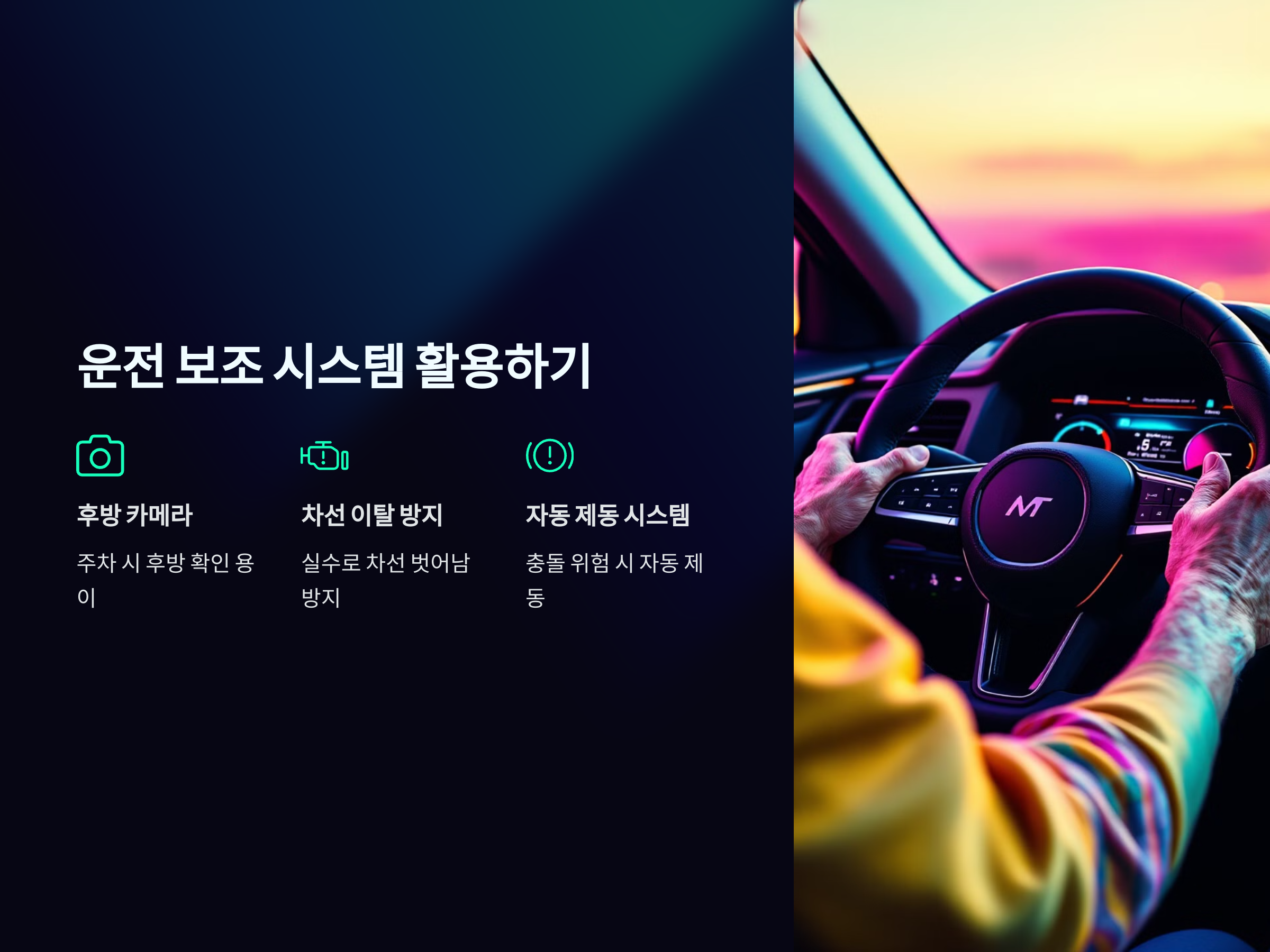 최신 차량에는 운전자를 도와주는 다양한 보조 시스템이 탑재되어 있습니다. 이러한 기능을 적극 활용하면 고령 운전자의 안전을 더욱 높일 수 있습니다.