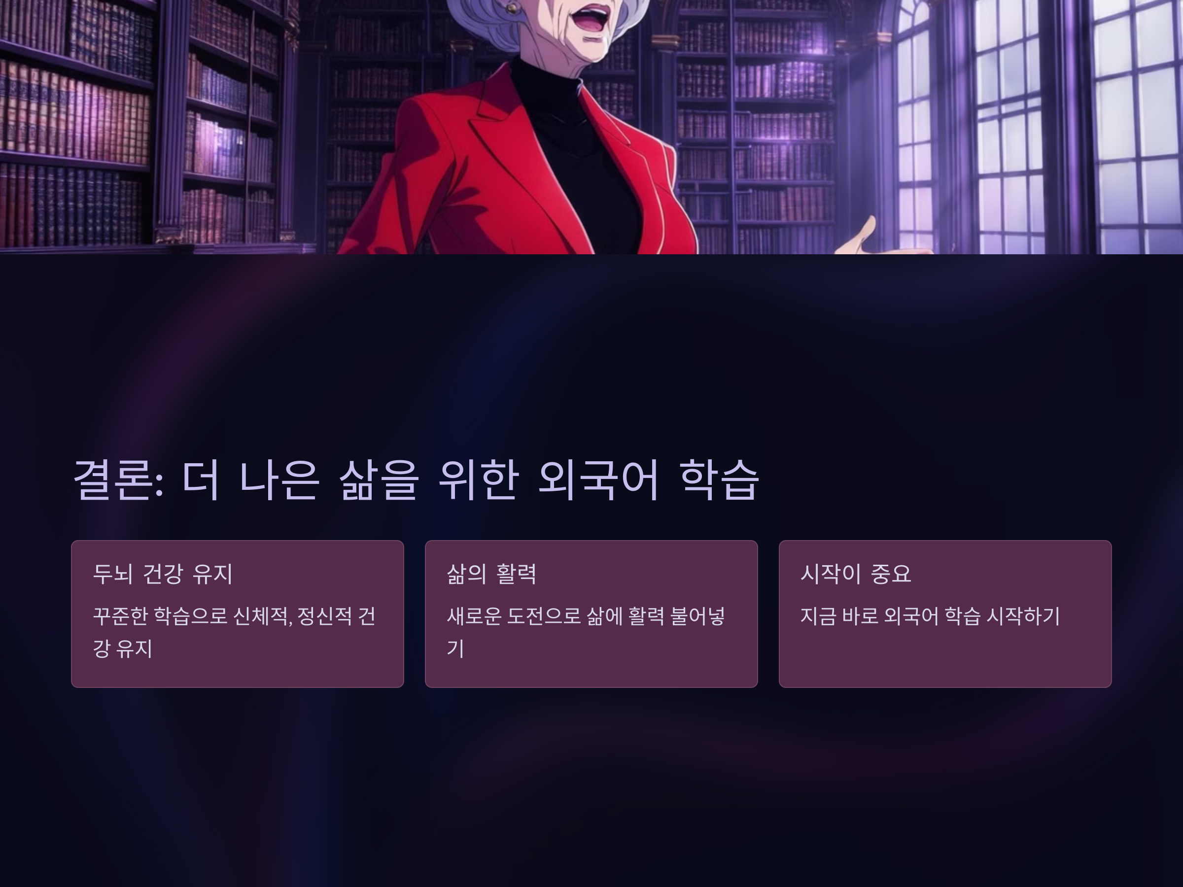 70대 이후에도 외국어 학습은 꾸준히 할 수 있는 활동입니다. 중요한 것은 자신에게 맞는 학습 방법을 찾고, 재미있게 학습을 이어가는 것입니다. 외국어를 배우는 과정은 두뇌 건강에 긍정적인 영향을 미치며, 삶의 질을 높이는 데 중요한 역할을 합니다. 이제 외국어 학습을 시작하고, 더 풍요로운 인생을 만끽해 보세요!