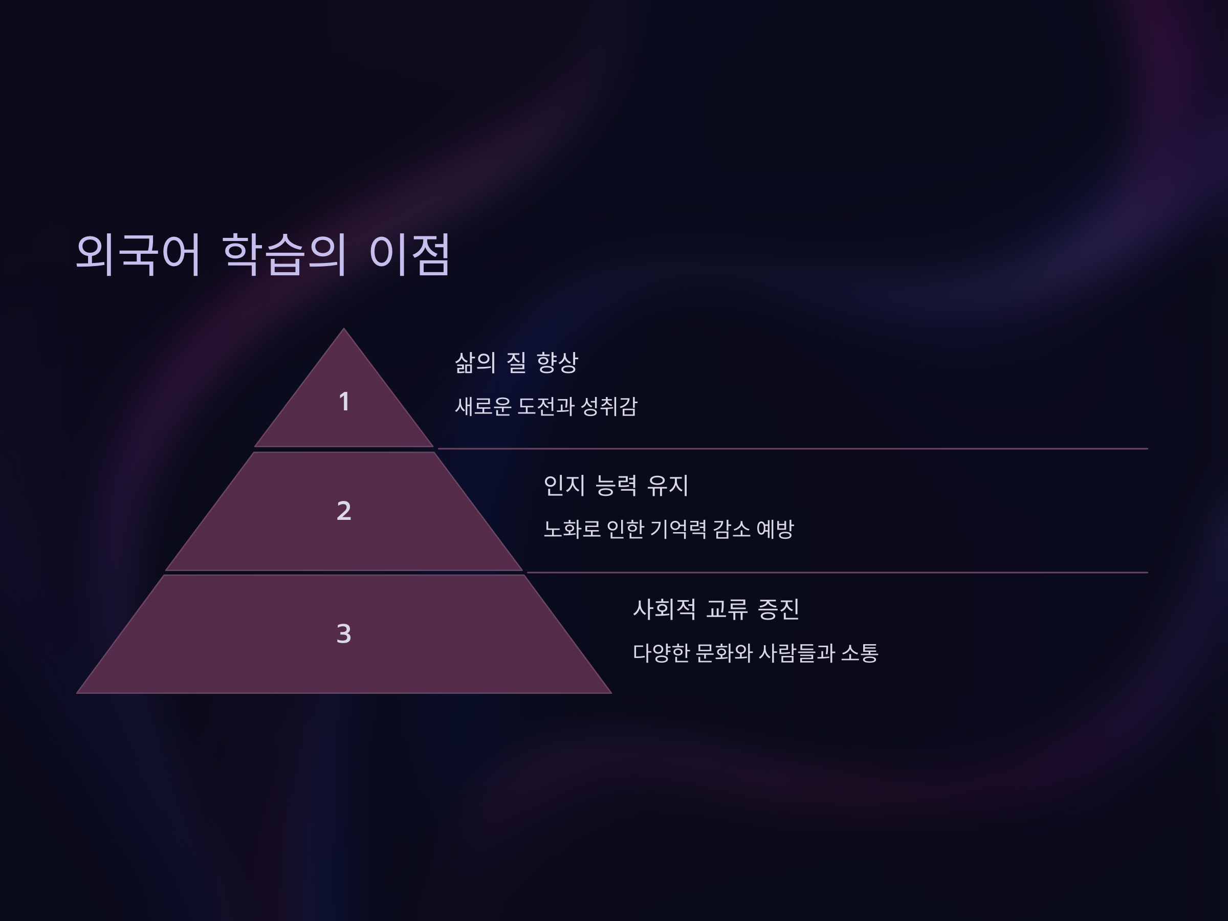 외국어를 배우는 것은 단순히 새로운 언어를 배우는 것 이상입니다. 연구에 따르면 외국어 학습은 뇌의 활동을 촉진하고, 기억력 및 집중력을 향상시키는 데 도움을 준다고 합니다. 70대 이후에도 꾸준한 외국어 학습은 노화로 인한 기억력 감소나 인지 능력 저하를 예방하는 데 큰 도움이 됩니다.