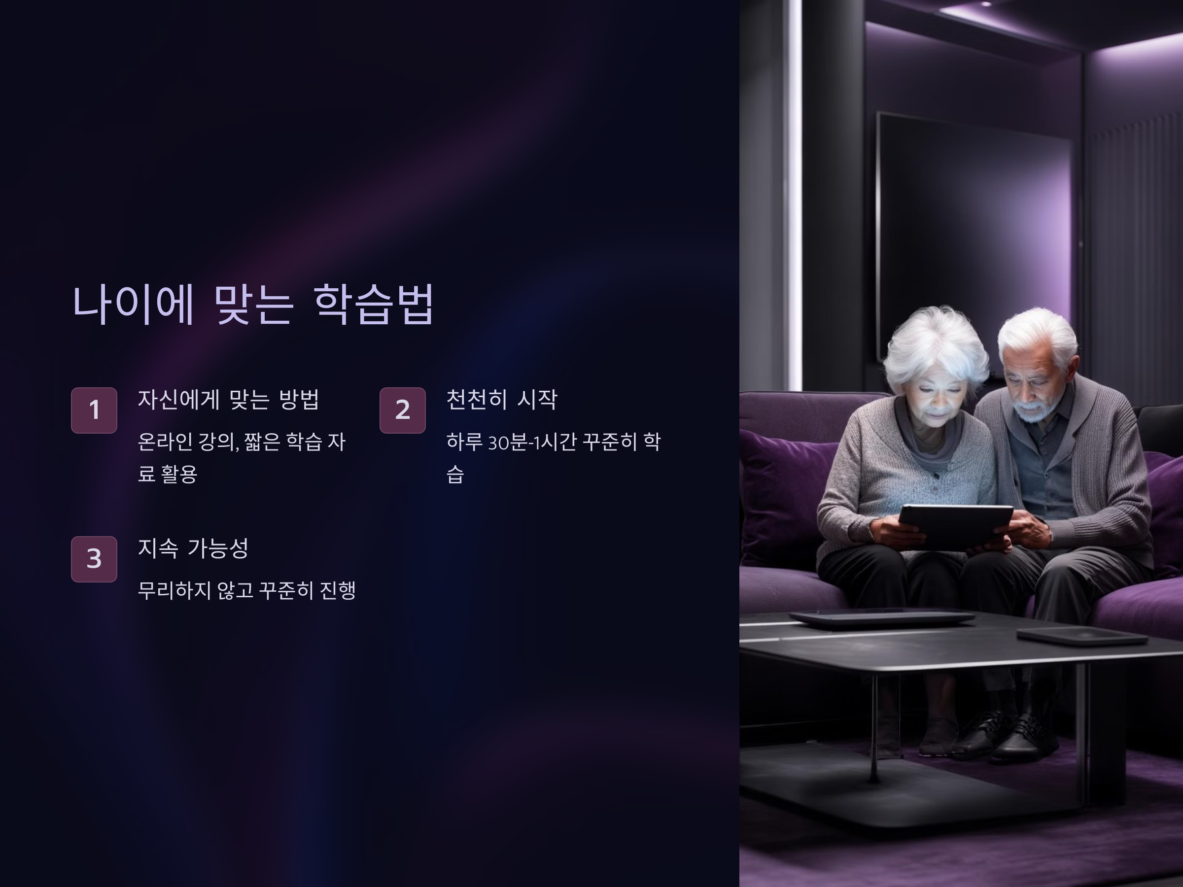 70대에는 기존에 많이 쓰던 학습 방식이 아니라, 자신에게 맞는 스타일을 찾는 것이 중요합니다. 예를 들어, 대면 수업보다는 온라인 강의를 듣는 것이 더 편리할 수 있고, 짧고 간결한 학습 자료를 활용하는 것도 좋은 방법입니다. 또한, 친구나 가족과 함께 학습하는 방식이 더 재미있고 지속 가능할 수 있습니다.