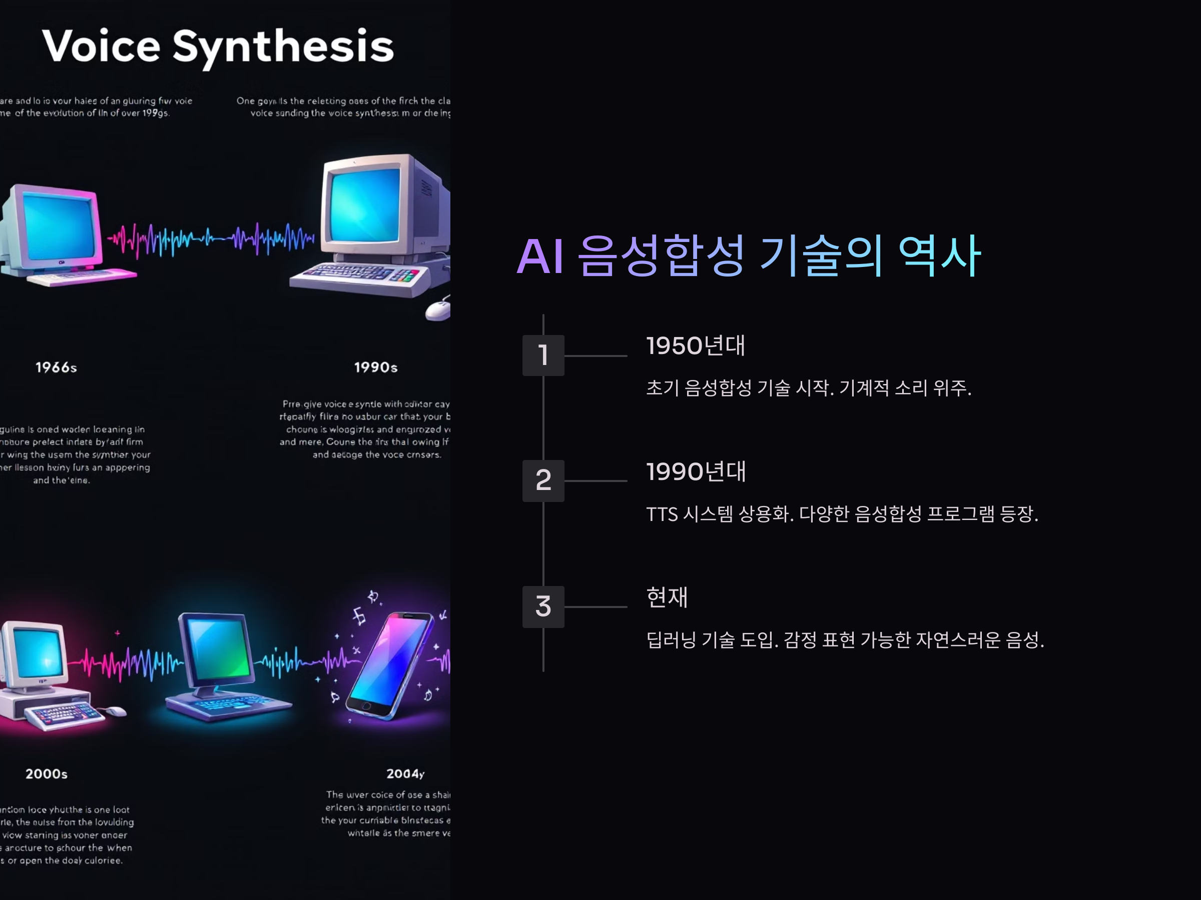 AI 음성합성 기술은 1950년대에 시작되었습니다. 초기의 음성 합성 기술은 매우 제한적이었고, 기계적인 소리가 대부분이었습니다. 그러나 시간이 지나면서, 인공지능과 기계 학습 기술의 발전에 힘입어 음성 합성의 품질은 눈에 띄게 향상되었습니다.