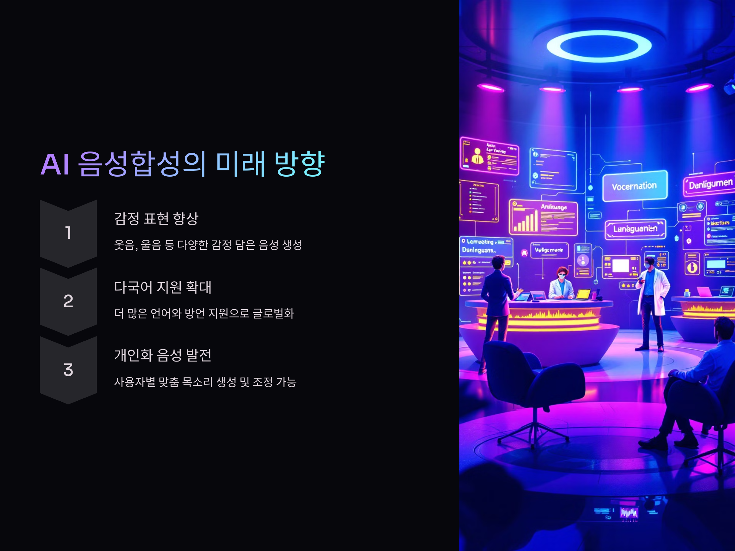 AI 음성합성 기술은 앞으로도 지속적으로 발전할 것입니다. 특히, 다음과 같은 방향으로 기술이 더욱 향상될 것으로 예상됩니다.