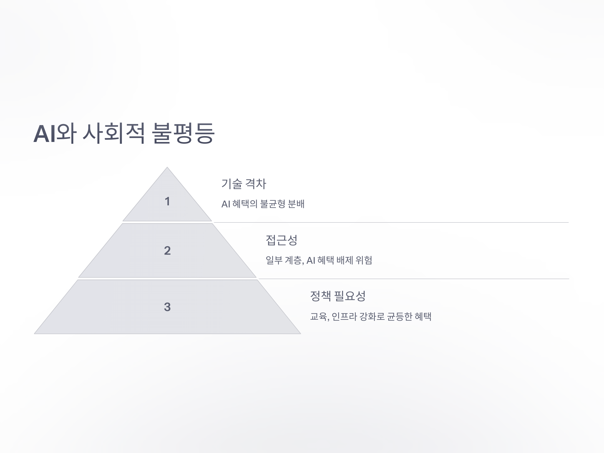 AI 기술의 혜택이 특정 계층이나 지역에만 집중될 경우, 사회적 불평등이 심화될 수 있습니다. 기술 격차로 인해 일부 사람들은 AI의 혜택을 누리지 못하거나, 오히려 불이익을 받을 수 있습니다. 따라서 AI 기술 개발과 보급에 있어 모든 사람이 동등하게 혜택을 받을 수 있도록 접근성을 높이고, 교육과 인프라를 강화하는 정책이 필요합니다.