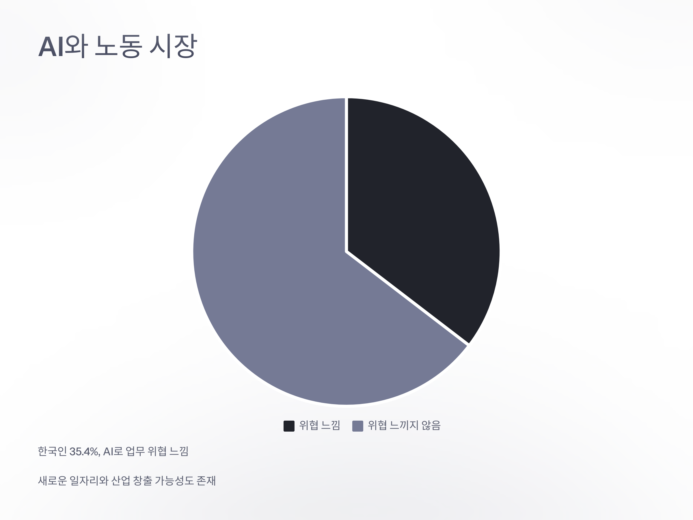 AI의 발전은 노동 시장에도 큰 영향을 미치고 있습니다. 한국보건사회연구원의 조사에 따르면, 한국인의 35.4%가 AI 등 신기술로 인해 자신의 업무가 위협받을 수 있다고 응답했습니다. 이는 이탈리아에 이어 두 번째로 높은 수치로, 많은 사람들이 AI로 인해 일자리를 잃을까 봐 우려하고 있음을 보여줍니다. 그러나 동시에 AI는 새로운 일자리와 산업을 창출할 수 있는 잠재력도 가지고 있어, 이에 대한 균형 잡힌 논의가 필요합니다.