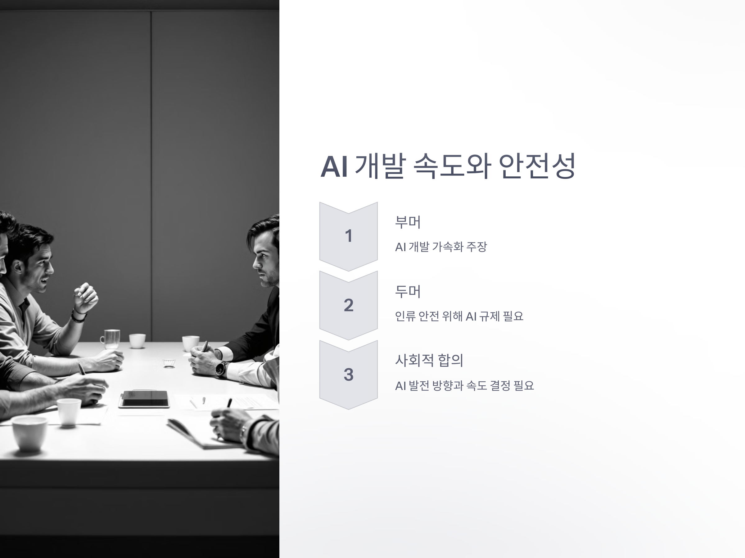 AI 기술의 발전 속도와 그에 따른 안전성에 대한 논쟁도 뜨겁습니다. 오픈AI의 샘 알트만 CEO의 해임 사태는 이러한 논쟁의 단면을 보여줍니다. 알트만은 AI 개발을 가속화해야 한다는 입장이었지만, 이사회는 인류의 안전을 위해 AI를 규제해야 한다는 입장을 취했습니다. 이는 AI 개발론자(부머)와 파멸론자(두머) 간의 갈등으로 해석되며, AI 기술의 발전 방향과 속도에 대한 사회적 합의의 필요성을 강조합니다.