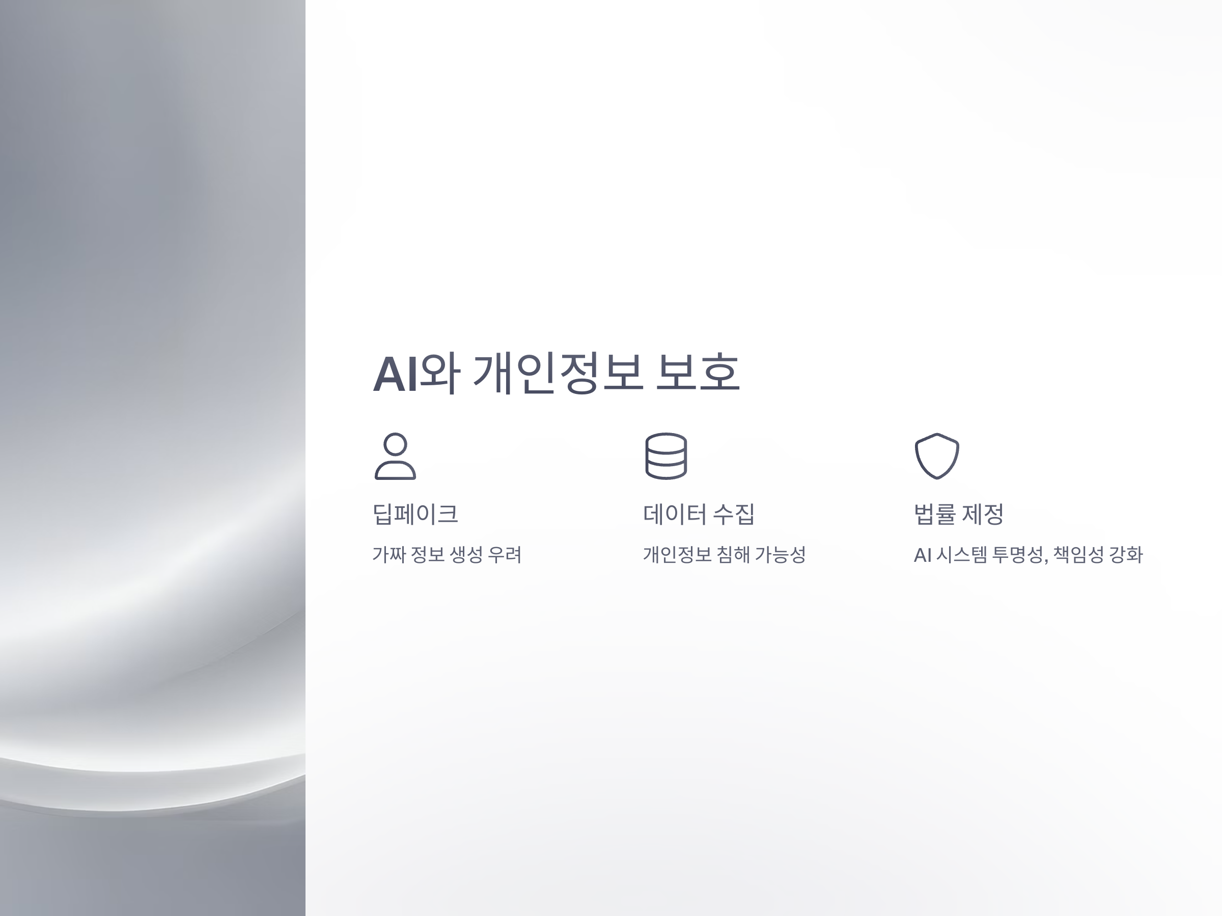 AI 기술의 발전은 개인정보 보호와 관련된 새로운 문제를 야기하고 있습니다. 딥페이크 기술을 활용한 가짜 정보 생성이나, AI 시스템이 방대한 개인 데이터를 수집하고 분석하는 과정에서 개인정보 침해 우려가 제기되고 있습니다. 이러한 문제를 해결하기 위해 각국에서는 관련 법률을 제정하고, AI 시스템의 투명성과 책임성을 강화하는 노력을 기울이고 있습니다.