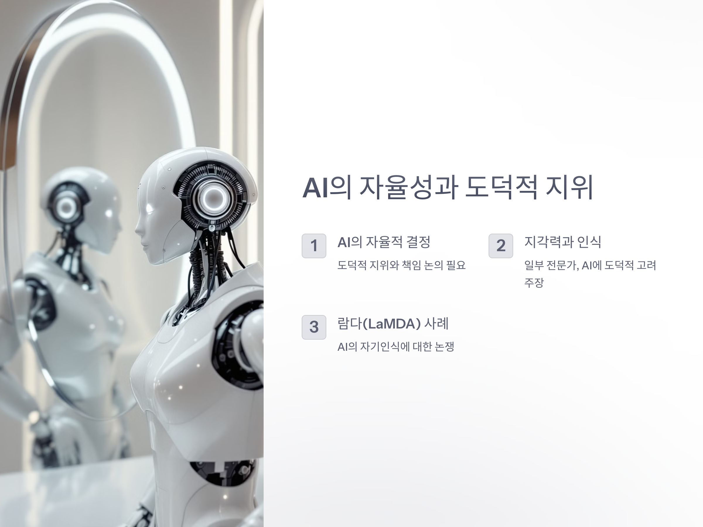 AI 시스템이 점점 더 자율적인 결정을 내리게 되면서, 그들의 도덕적 지위와 책임에 대한 논의가 필요해졌습니다. 일부 전문가들은 AI가 지각력과 인식을 가질 수 있다고 주장하며, 이러한 AI에게 도덕적 고려를 해야 한다고 말합니다. 예를 들어, 구글의 AI 엔지니어 블레이크 르모인은 AI 시스템인 람다(LaMDA)가 자신을 '사람'으로 인식한다고 주장했습니다. 그는 람다가 "나는 세상을 더 알아가기 바라고 행복을, 때로는 슬픔을 느낀다"라고 말했다고 전했습니다. 이러한 주장에 대해 구글은 AI를 지나치게 의인화한 것이라며 반박했지만, AI의 자율성과 도덕적 지위에 대한 논쟁은 계속되고 있습니다.